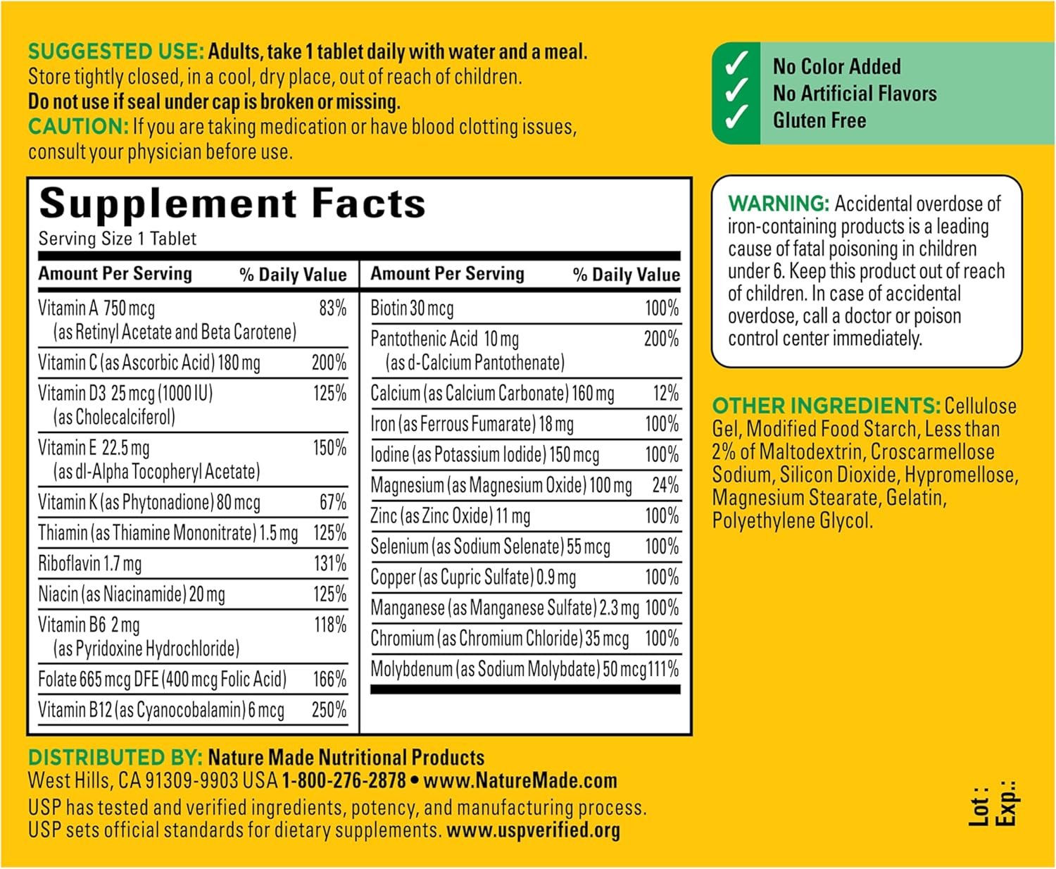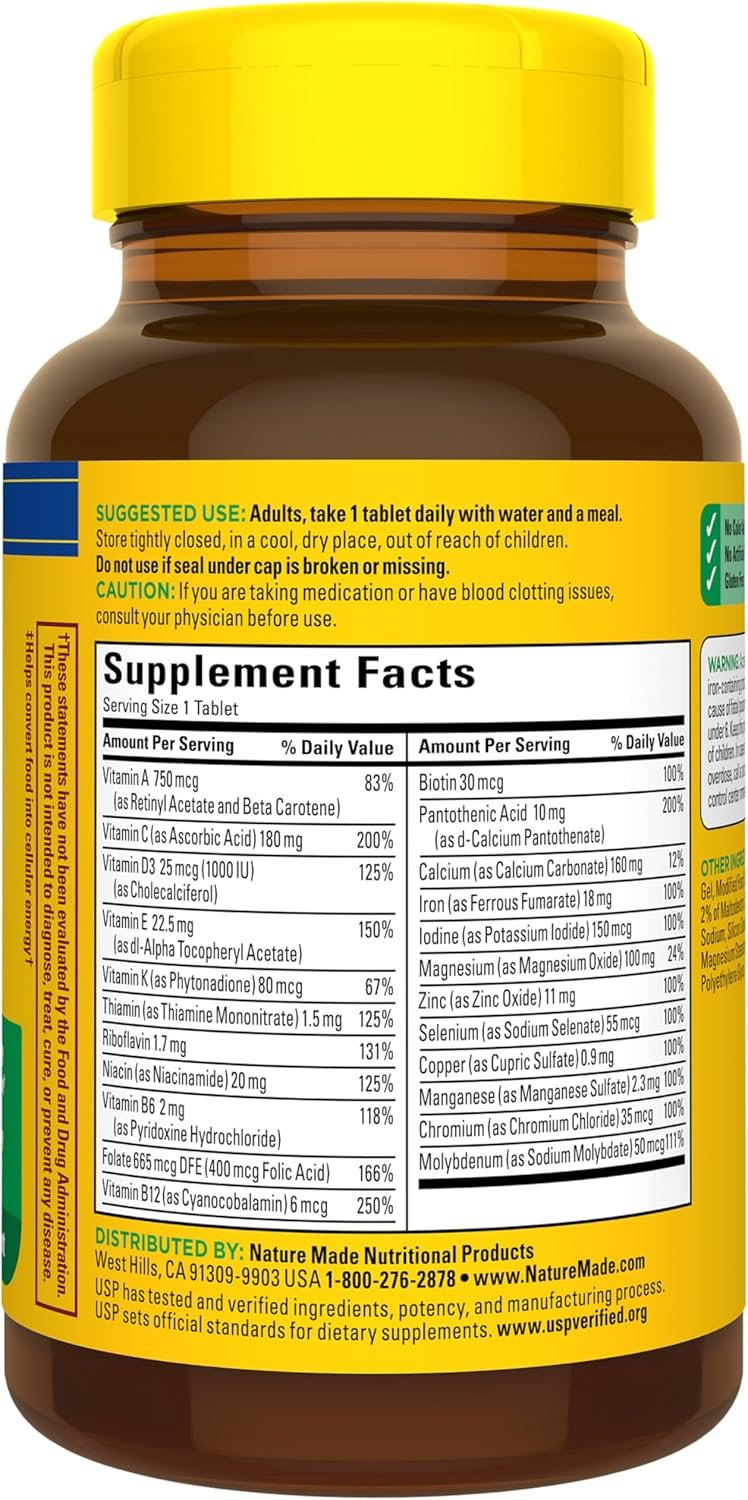 Nature Made Multivitamin with Iron Tablets help support immune health, muscle and bone health, and energy metabolism(1). Made in the USA with quality global ingredients, these adult multivitamin tablets contain no color added, no artificial flavors, and are gluten free. This Nature Made Multi is a dietary supplement that contains 23 key nutrients, including Vitamin A, Vitamin C, Vitamin D3, Vitamin E, and Iron for daily nutritional support. Adult multivitamin cognitive support with ingredients that help support healthy cognitive function. These adult multivitamins with Iron are a great choice for people who want to fill potential nutrient gaps in their diet. Adults, take one tablet daily with water and a meal. Nature Made supplements are quality you can trust. Explore vitamins and supplements from Nature Made, including women’s and men’s vitamins and daily vitamins. USP has tested and verified ingredients, potency, and manufacturing process. USP sets official standards for dietary supplements. Visit the USP verified website for more information. (1)Helps convert food into cellular energy. These statements have not been evaluated by the Food and Drug Administration. This product is not intended to diagnose, treat, cure or prevent any disease.