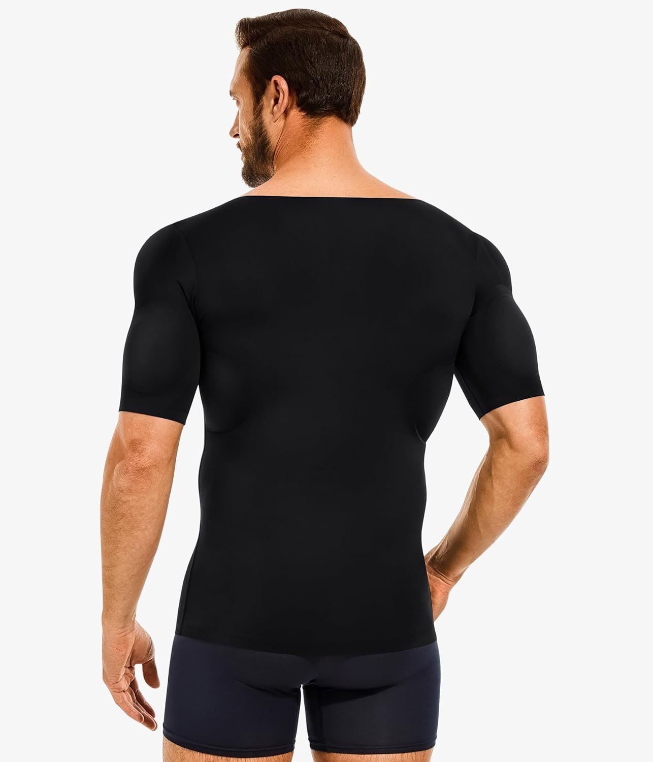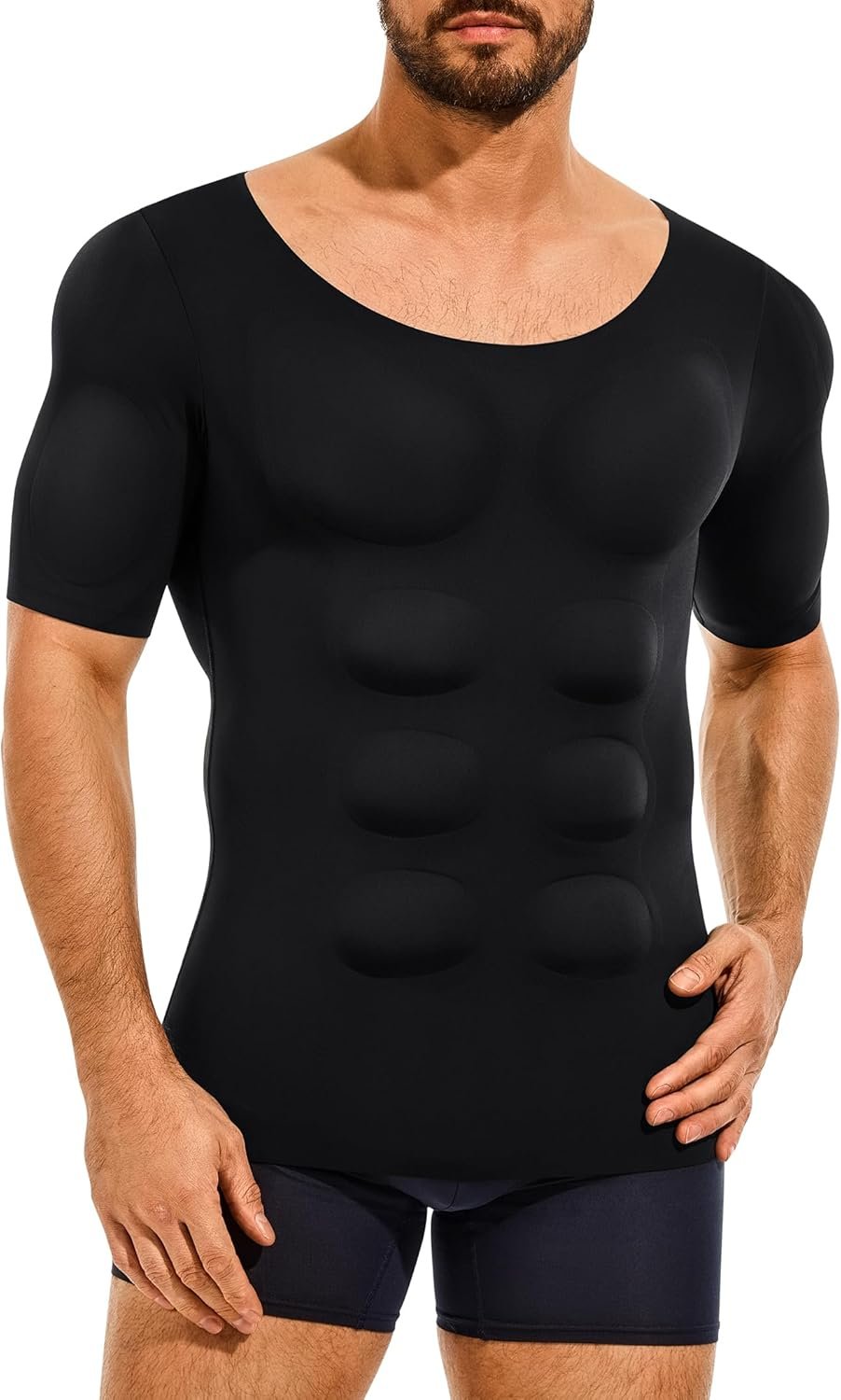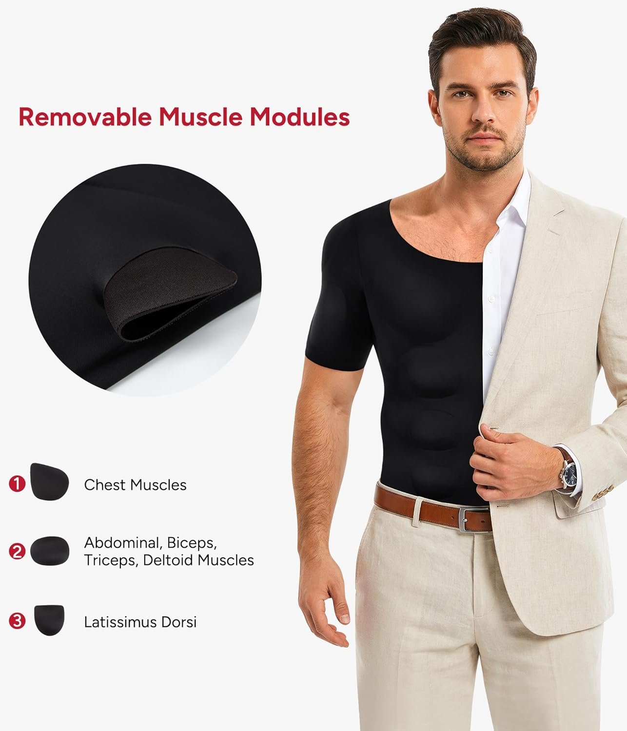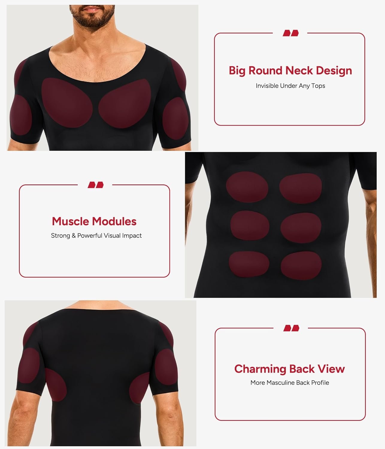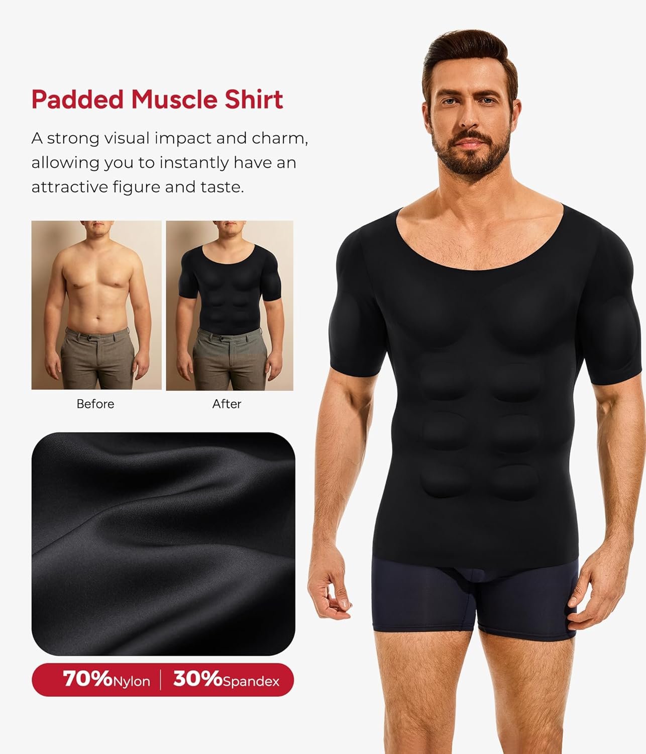 Nebility Padded Mens Compression Shirt – Short Sleeve Men Body Shaper Fake Muscle Shirts Body Builder Suit Removable Pad