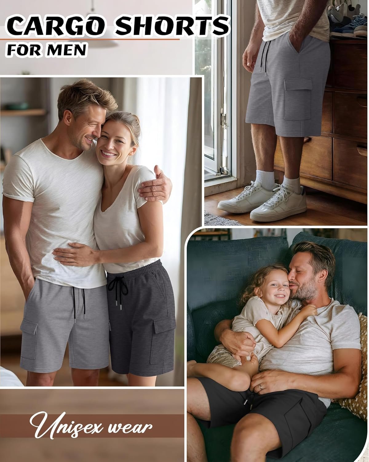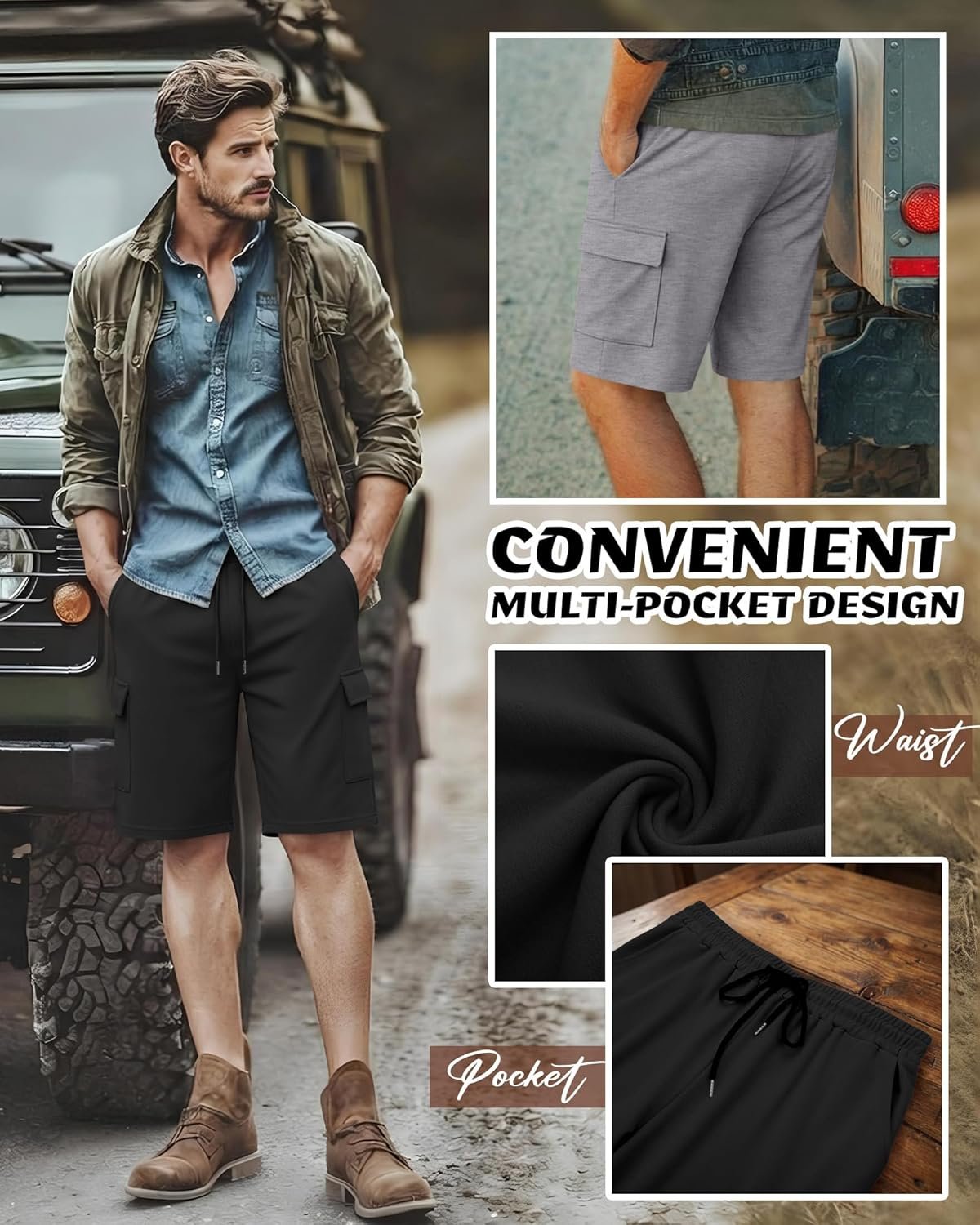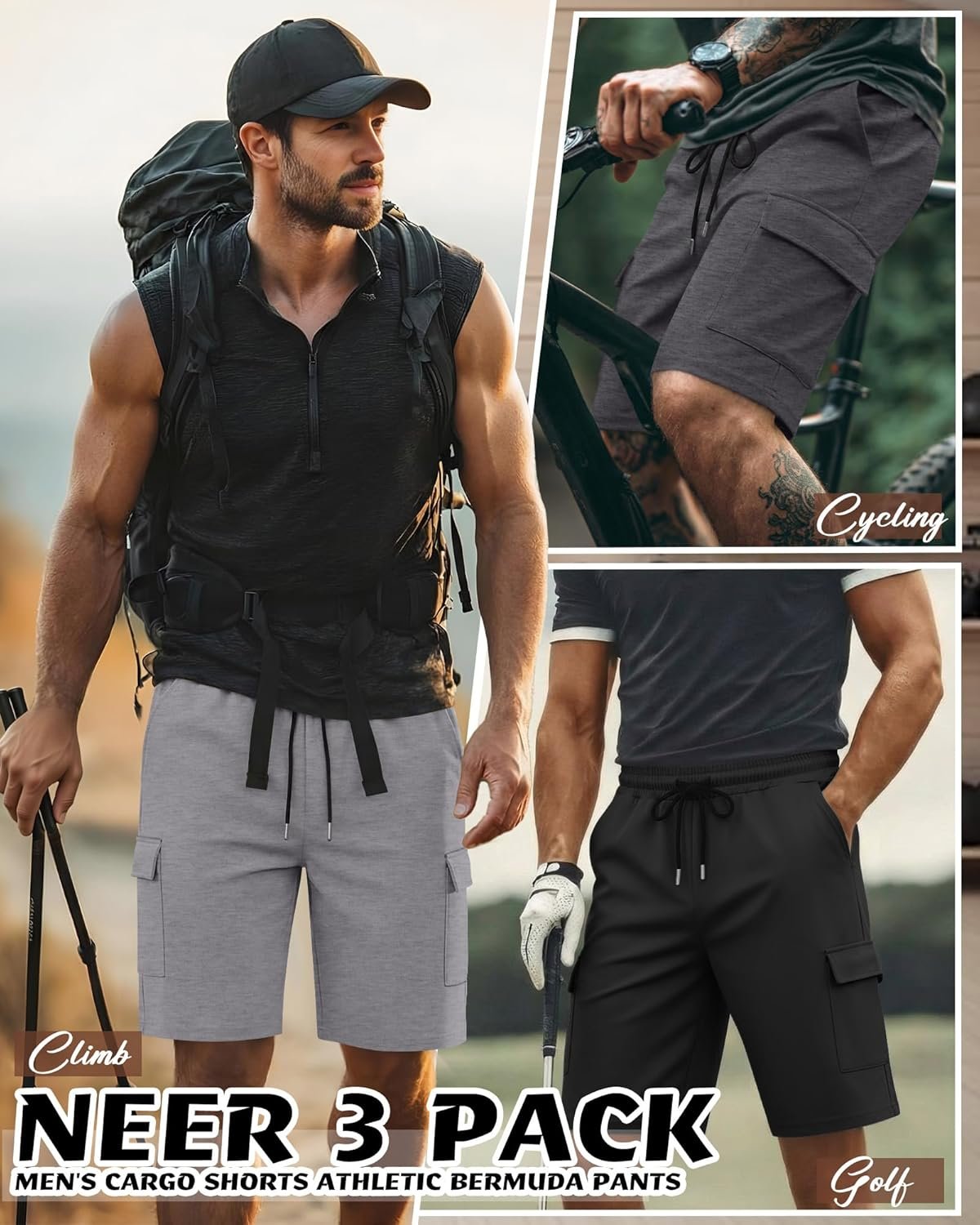 Neer 3 Pack Men’s Cargo Shorts Athletic 9″ Bermuda Pants with Pockets Knee Length Workout Drawstring Gym Sweat Shorts Summer