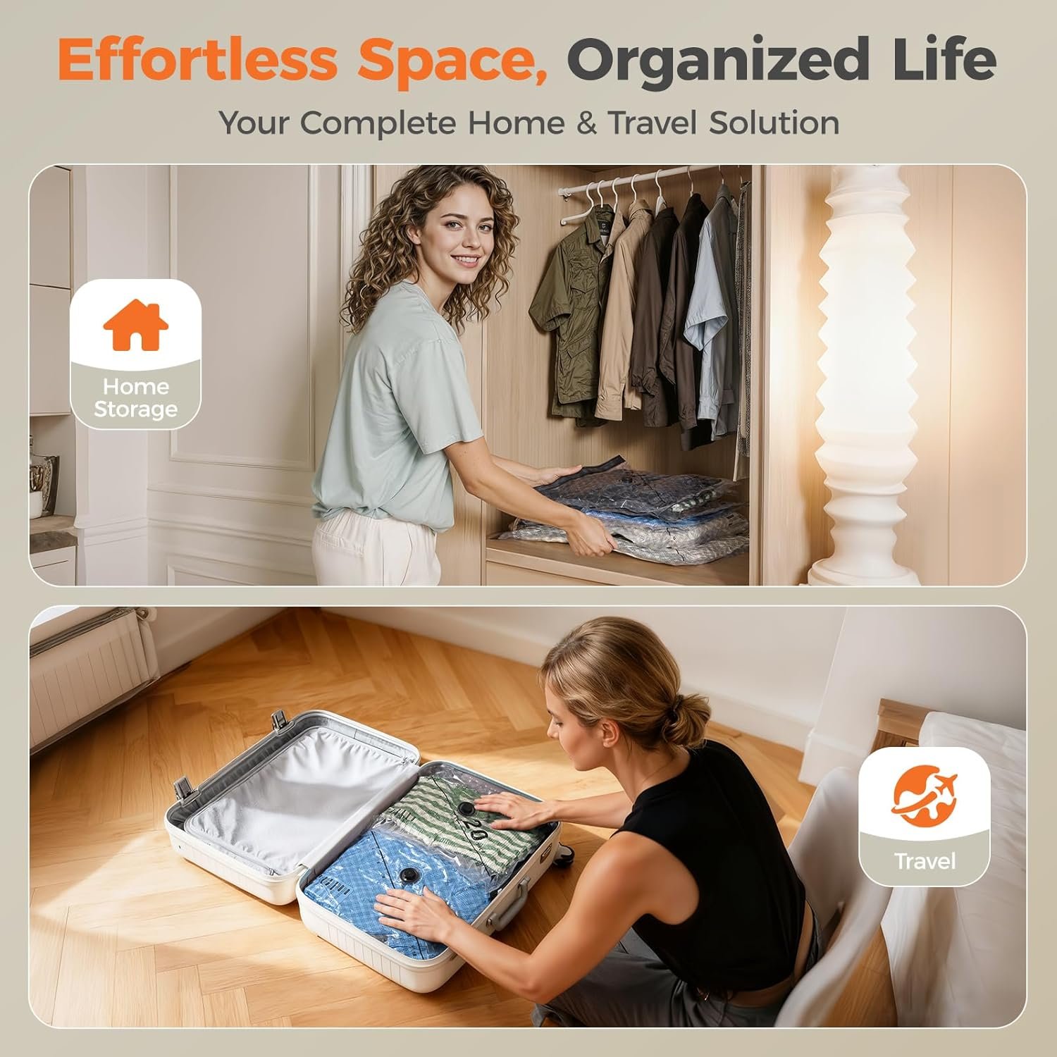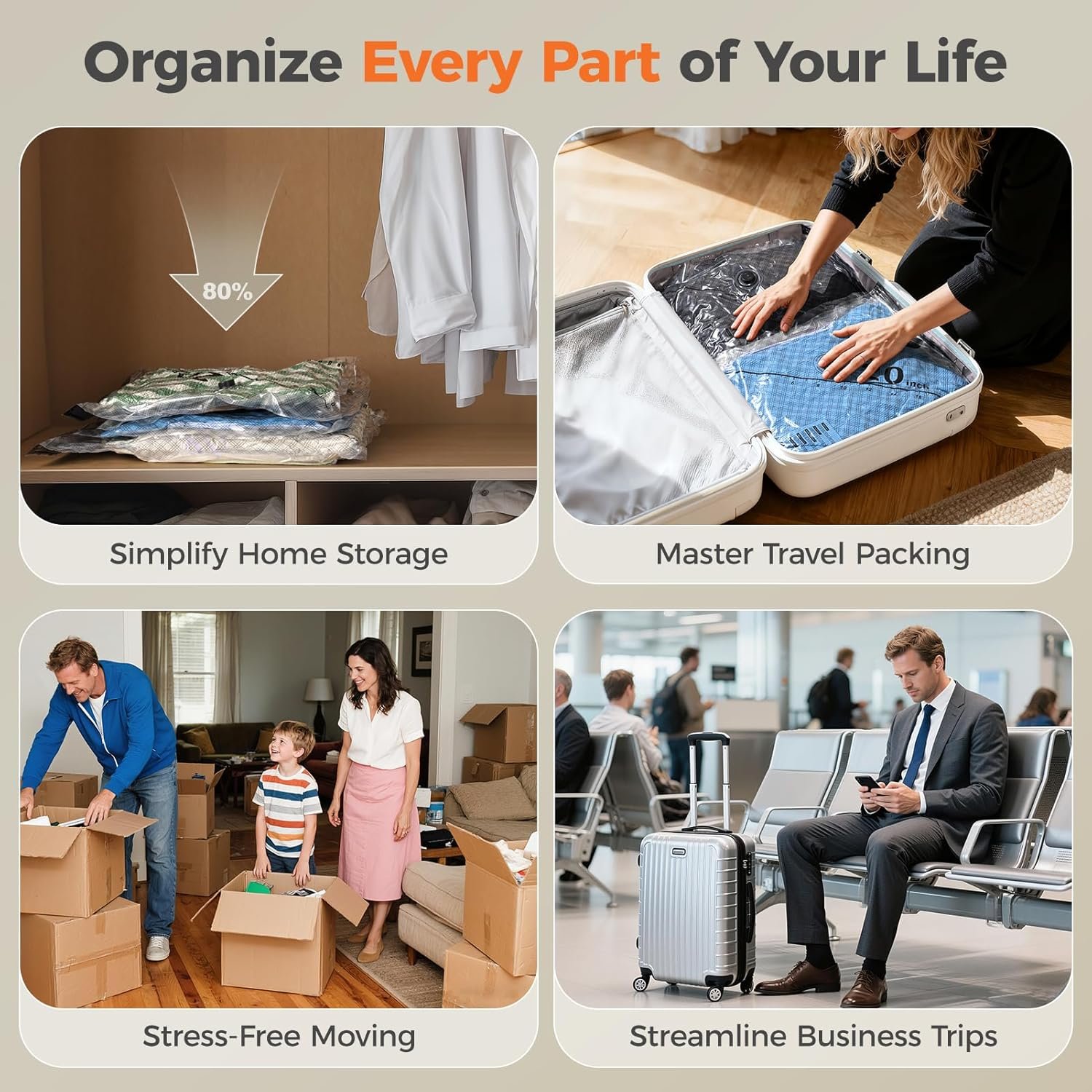 Complete 3-Size Space-Saving Kit– 18 bags in 3 precise sizes (S:15.8″x19.7″, M:18.5″x23.6″, L:21.3″x27.6″) fit everything from tees to coats. Save up to 80% space in luggage and closets.