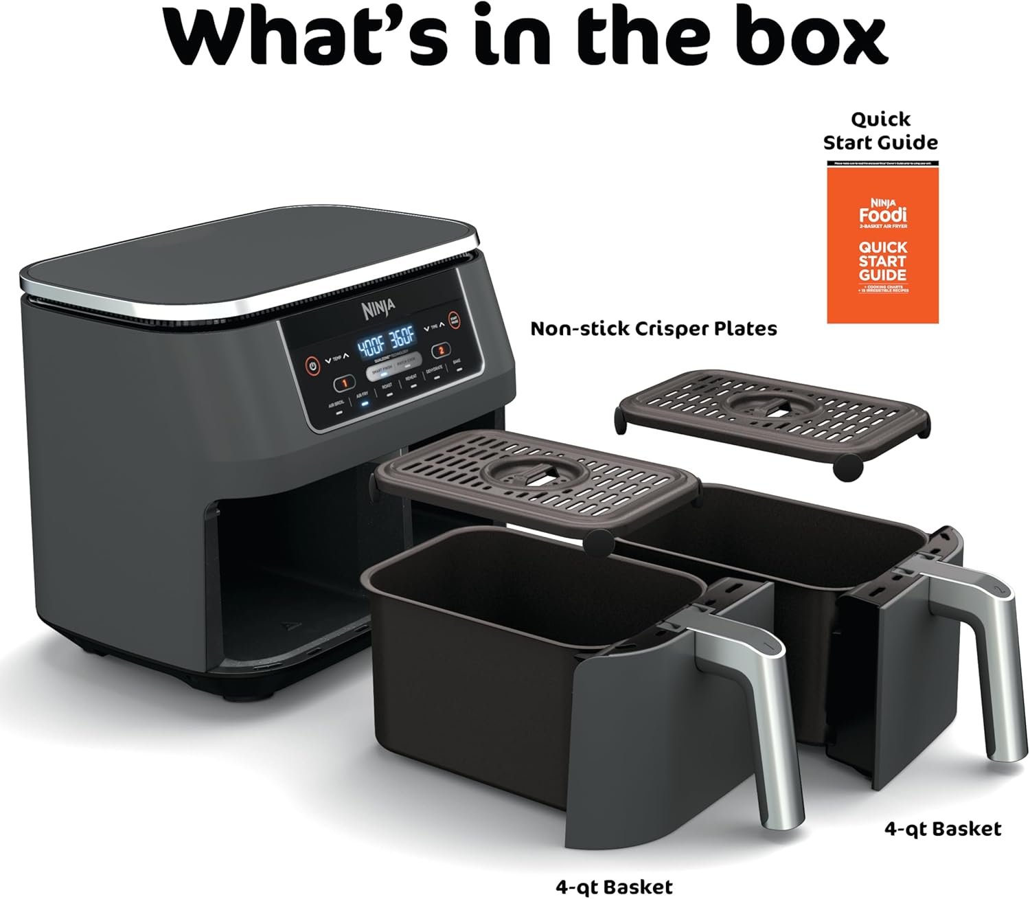 Ninja DZ201 Foodi 8 Quart 6-in-1 DualZone 2-Basket Air Fryer with 2 Independent Frying Baskets, Match Cook & Smart Finish to Roast, Broil, Dehydrate & More for Quick, Easy Meals, Grey
