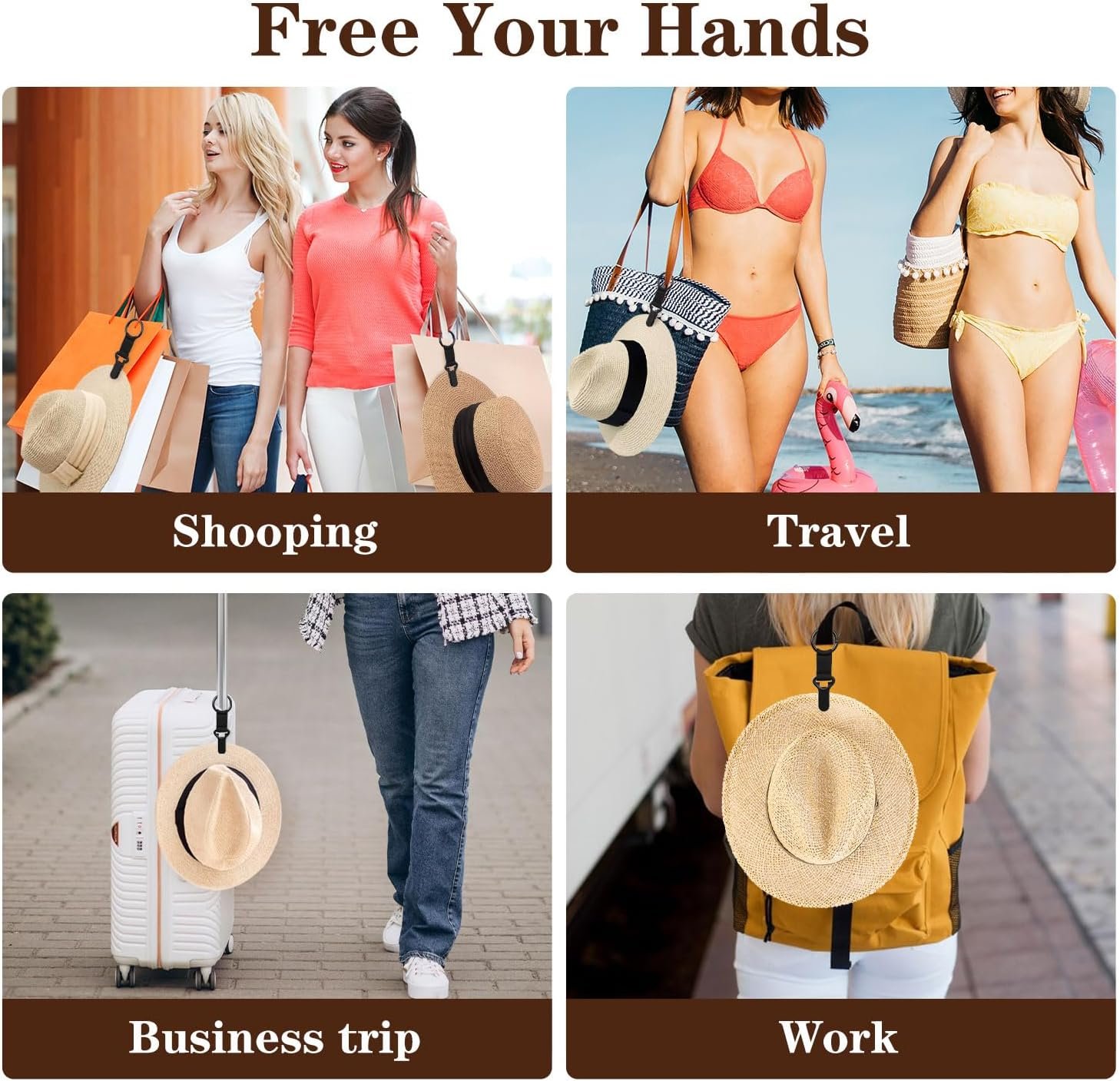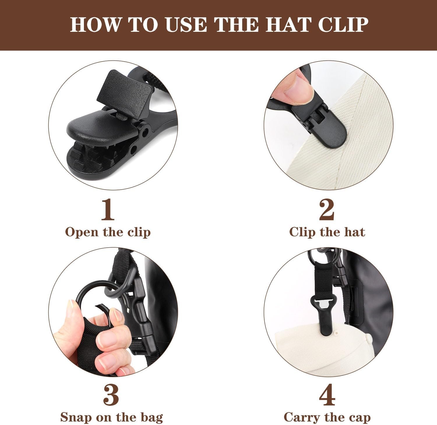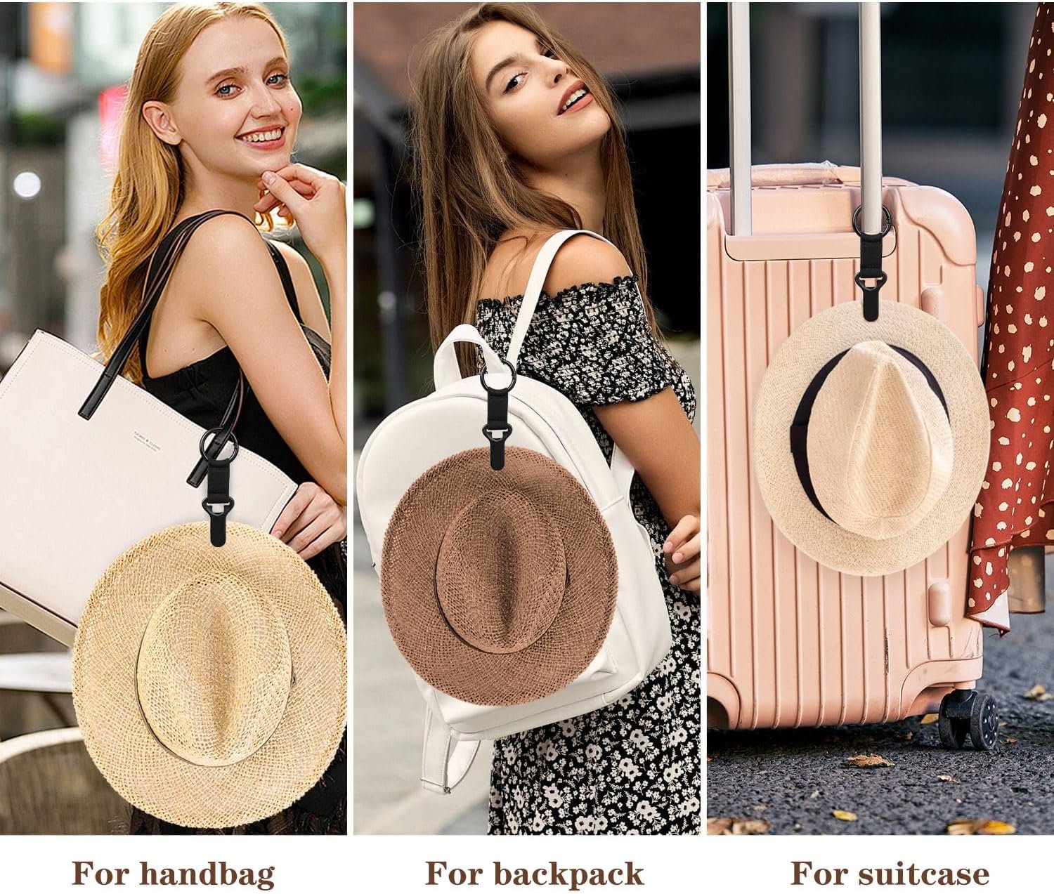 【Widely Compatible—Just Clip It On】- It works well with a wide range of hat styles, including baseball caps, bucket hats, sun hats, and thin cowboy hats, and is compatible with various brim materials such as fabric, straw, and leather. It can be easily attached to backpacks, purses, tote bags, luggage and other travel gear, and can also secure items like scarves.