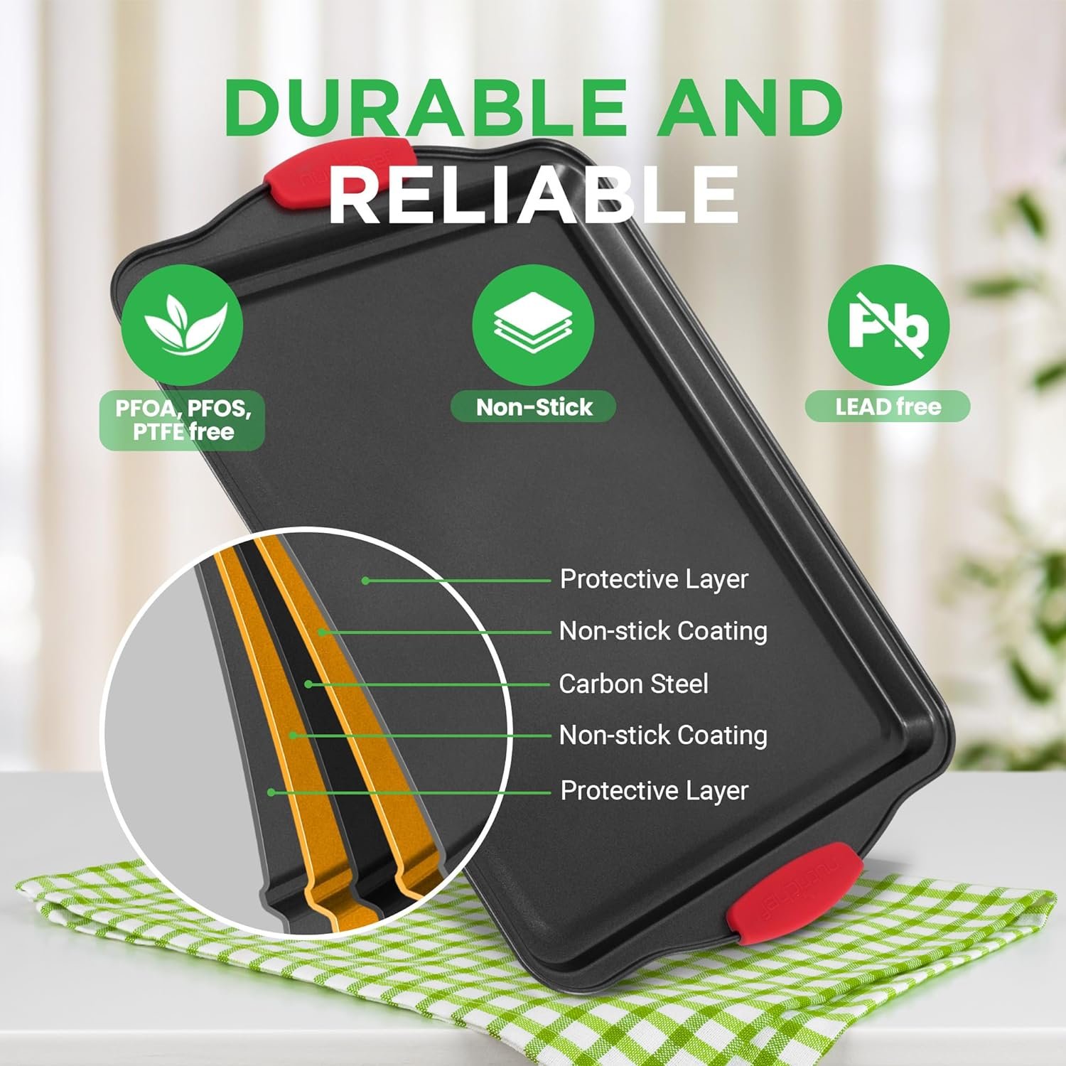 DURABLE BAKEWARE SET: These cookie pans are made from carbon steel & non-stick coating that resists warping to keep your baking, roasting & toasting for years. It is suitable for the oven, refrigerator, and freezer. A reliable cookie sheet oven pan style