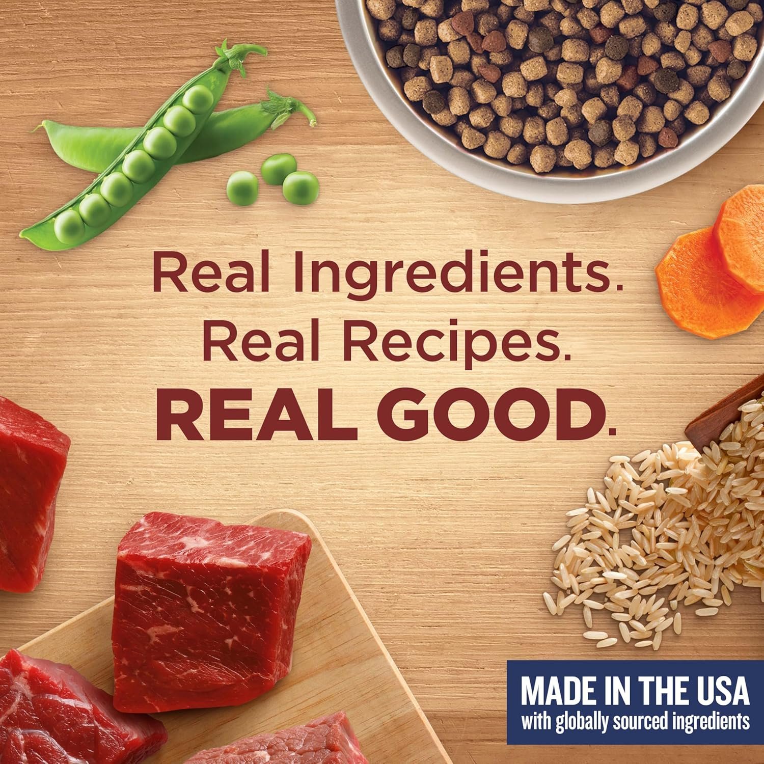 Rachael Ray Nutrish Real Beef, Pea & Brown Rice Recipe is dry dog food for adult dogs of all breed sizes. Made with real beef as the #1 ingredient, this beef dog food recipe brings rich, savory flavor that even picky eaters enjoy finishing. This natural dog food with added vitamins, minerals & nutrients is full of real ingredients they love. Mealtime excitement kicks in the second the bag opens — trotting toward the bowl, licking their lips, or doing happy little spins as they wait for their food. Real Ingredients. Real Recipes. Real Good — inspired by meals pet parents would proudly create in their own kitchen. High-quality, carefully selected ingredients are used in every Nutrish™ complete and balanced meal. Our specially crafted recipes are backed by a team of nutrition and dog experts. This beef dog food recipe is made in the USA with globally sourced ingredients, and each 5 lb. bag dog food is crafted with care while also helping support animal welfare efforts through The Rachael Ray Foundation. Store the bag in its original packaging or an airtight container to keep it fresh. Most adult dogs do well with two meals a day, but portions can shift based on their age and activity level. Learn more about Nutrish™ at nutrish.com.