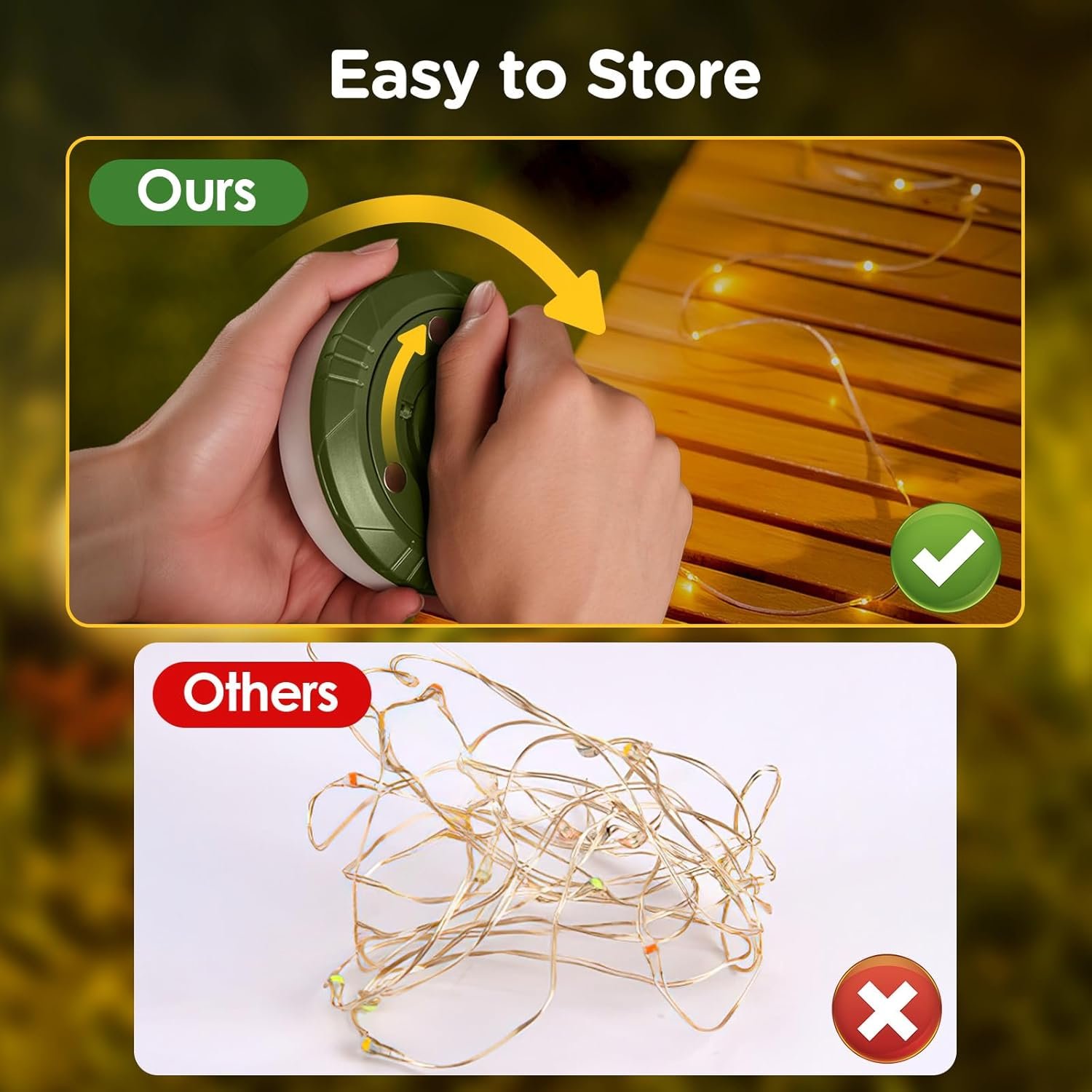 Portable Storage: The camping light is only 7.4 ounces that very lightweight and portable, it can be easily put into a backpack or handheld device, a quick turn of the handle and the manual device ,32.8FT string lights can resume the camping light in only 30 seconds. The clever design of the string lights for camping ensures portable storage. Undoubtedly a camping essentials.