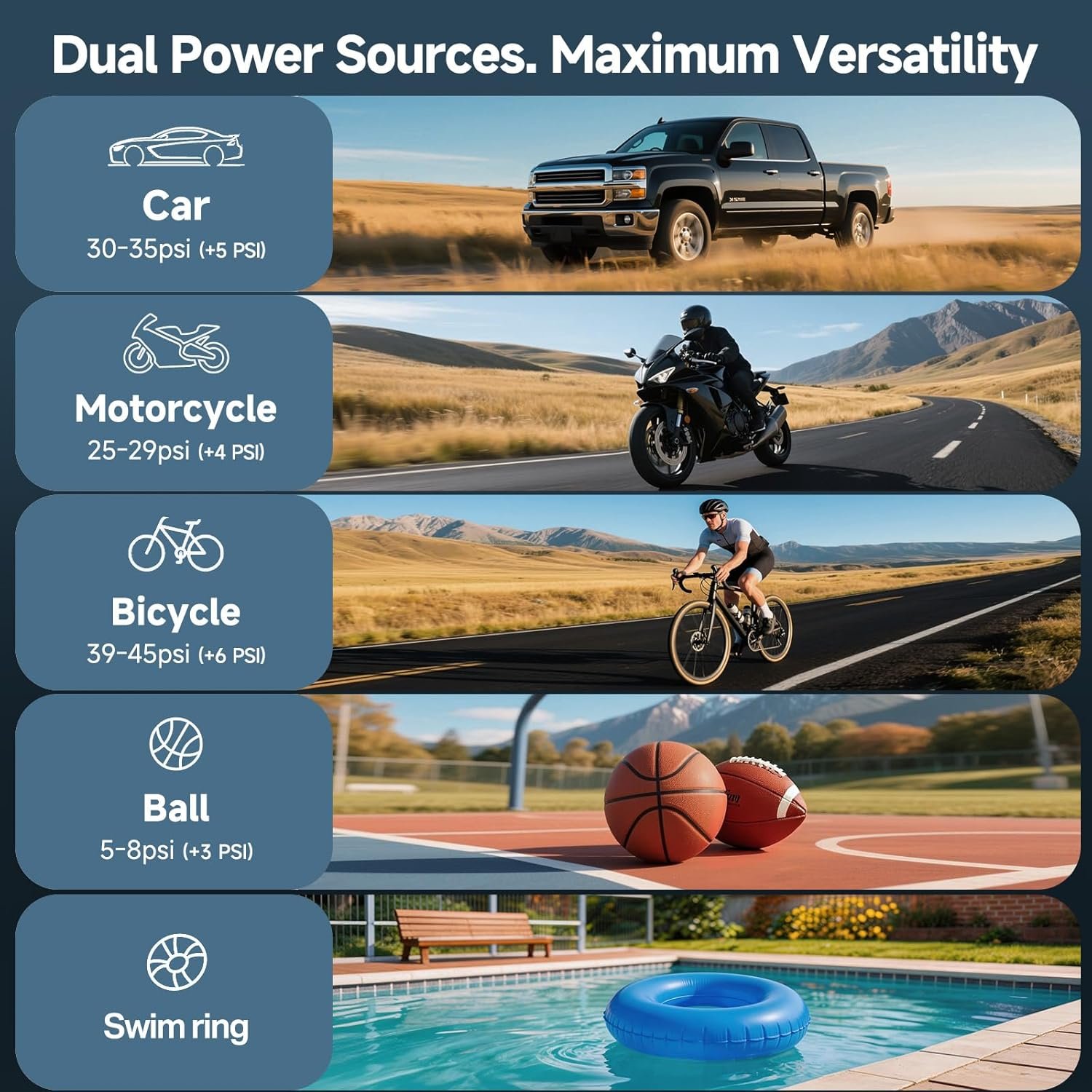 [Dual Power Mode: Power Your Way] Enjoy ultimate inflation flexibility. This tire inflator operates in two convenient ways: Cordless Freedom: Use the built-in rechargeable battery for quick, on-the-go inflation anywhere Continuous Power: Plug into any standard 12V car cigarette lighter using the included cable for endless, worry-free operation
