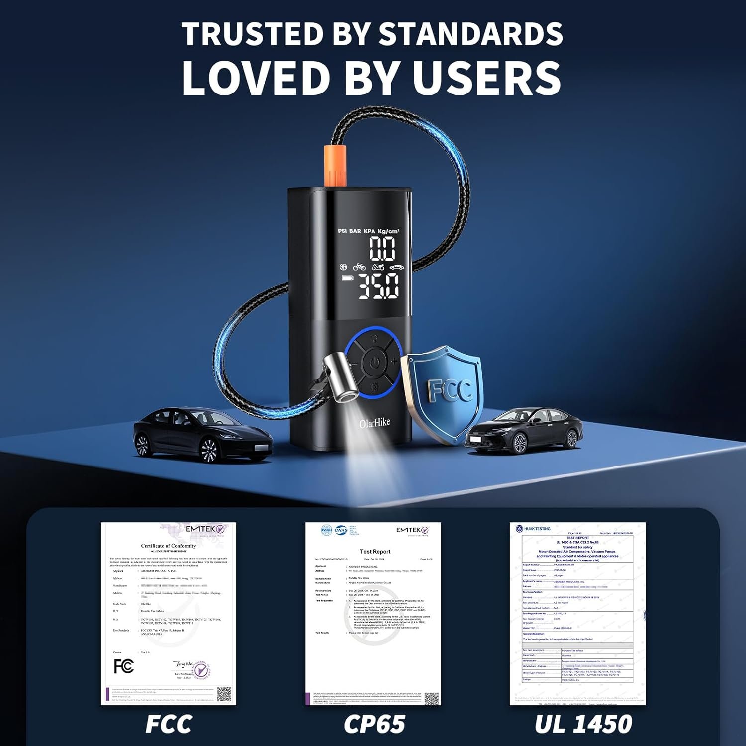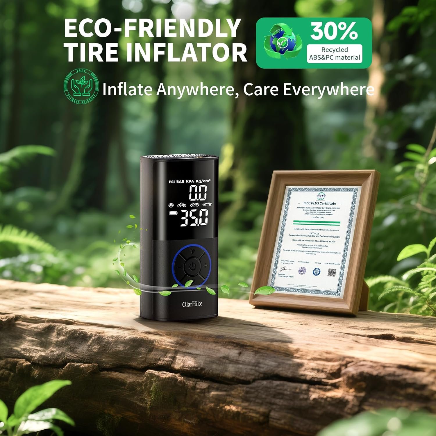 【ECO-FRIENDLY】Certified to ISCC standards, the OlarHike Tire Inflator Portable Air Compressor meets strict sustainability requirements. By choosing this eco-conscious design, you support reduced carbon impact and responsible resource use, while still enjoying reliable inflation performance wherever you go