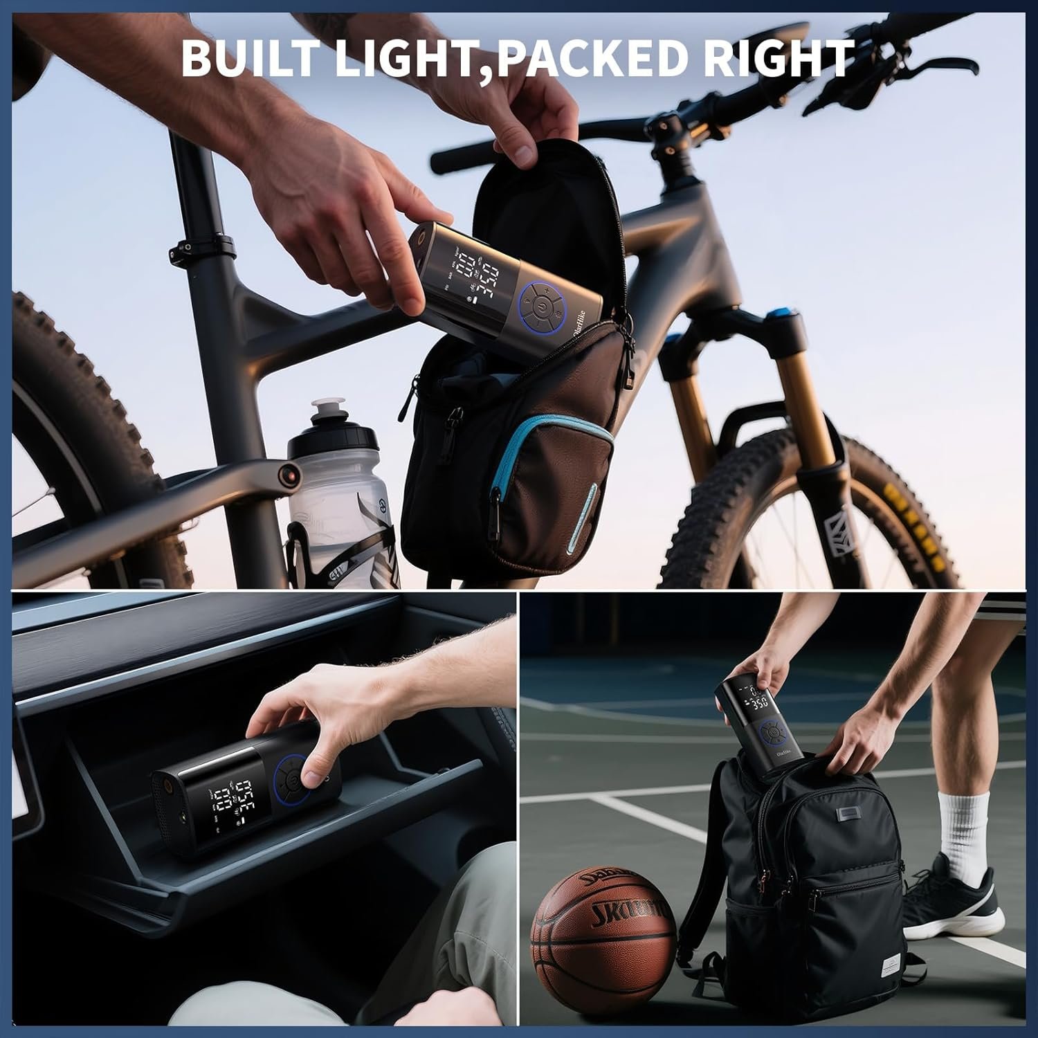 【PORTABLE AND CORDLESS DESIGN】 The OlarHike portable air pump features a compact, cordless design and weighs only 0.95 pounds, making it easy to carry wherever you go. It supports four pressure units (PSI, BAR, KPA and kg/cm²) to suit your needs. Equipped with multiple attachments and a built-in LED emergency light for low-light situations, it’s an essential tool for drivers, cyclists, and adventurers