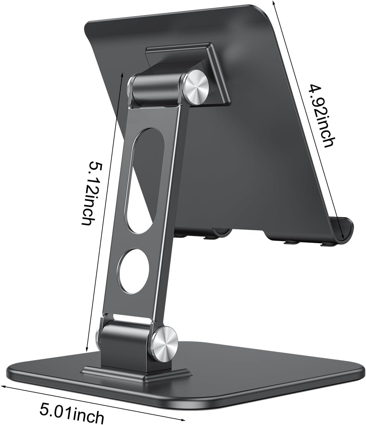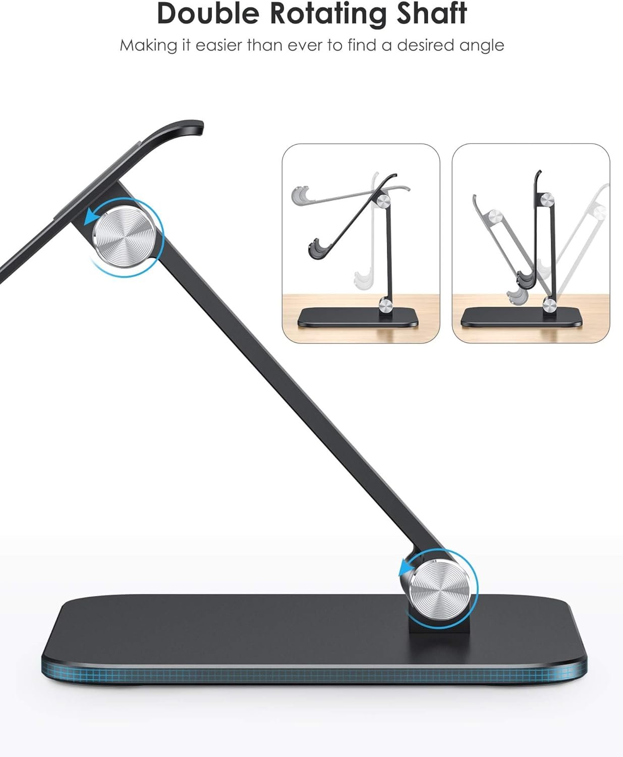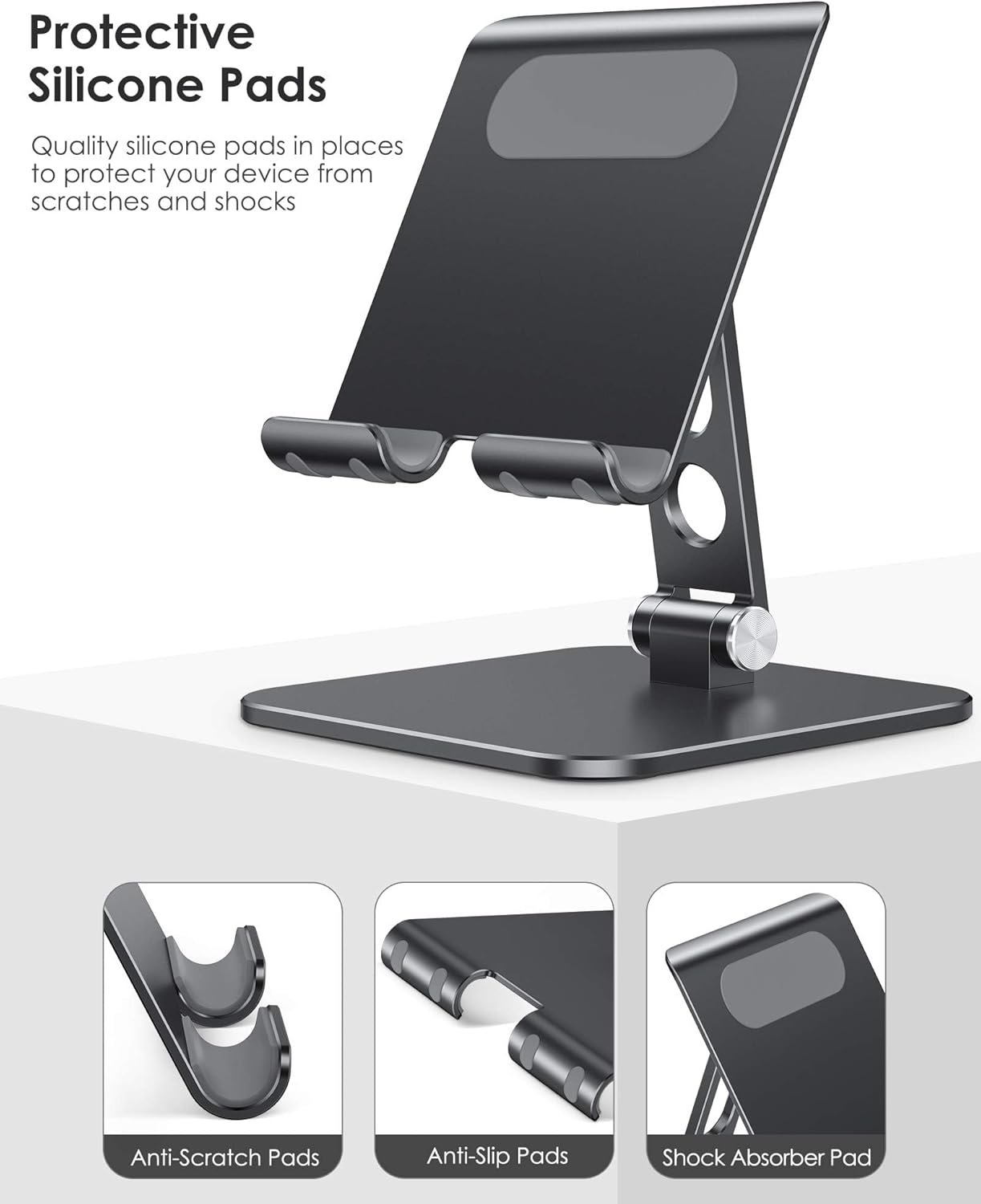 All-Round Protection: Equipped with a soft back pad to prevent scratches on devices and non-slip rubber feet underneath to keep the adjustable tablet stand for desk firmly in place on tables, countertops, and nightstands.