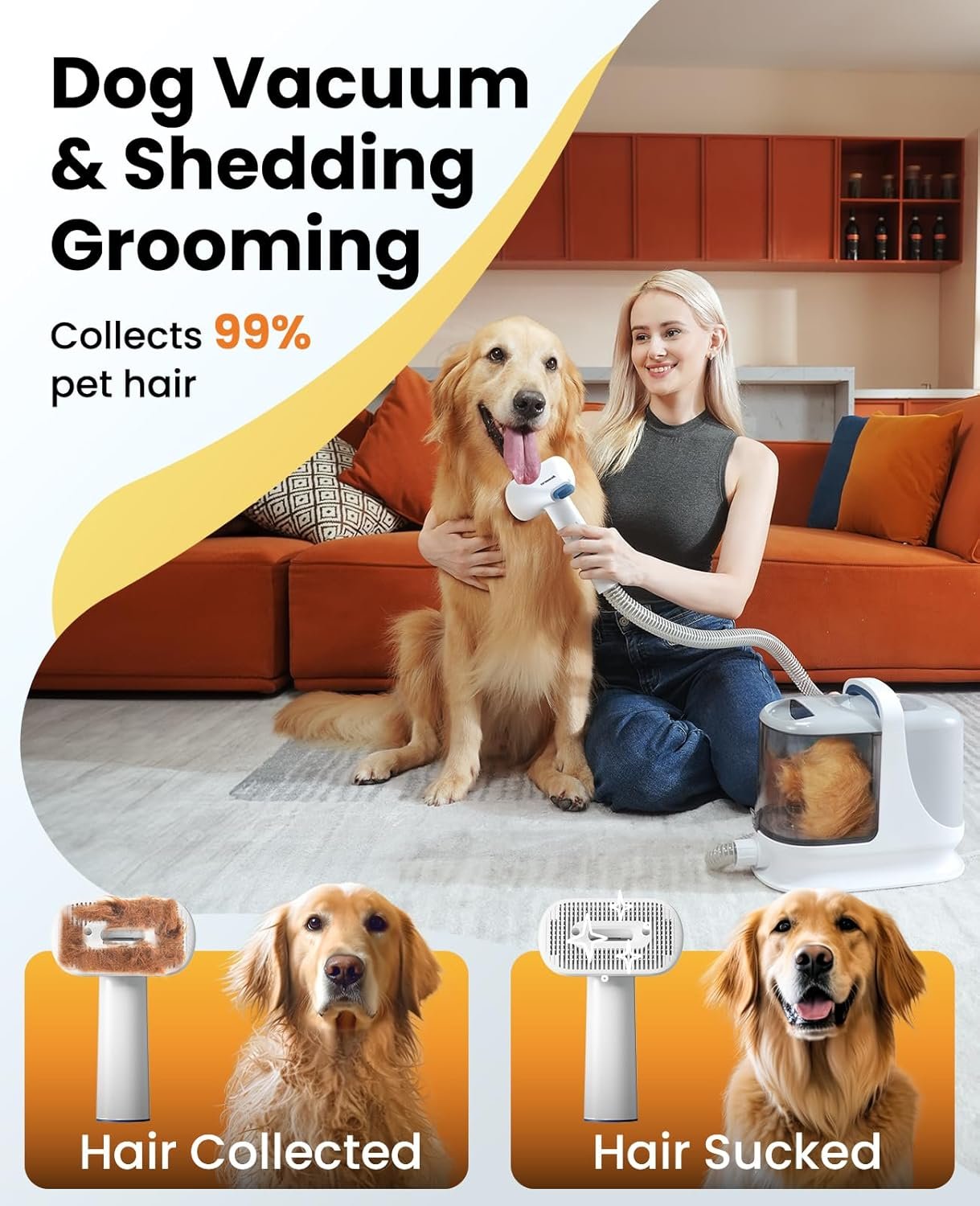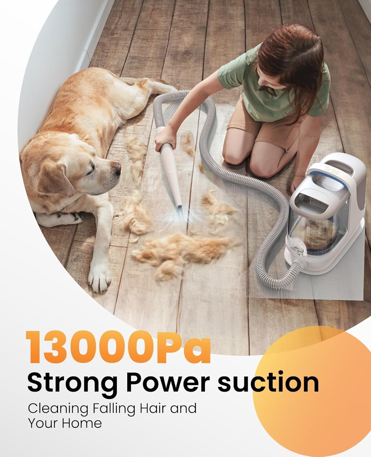 𝟏𝟑𝟎𝟎𝟎𝐏𝐚 𝐏𝐨𝐰𝐞𝐫𝐟𝐮𝐥: Experience a cleaner, faster way to groom with our 13KPa strong suction dog grooming vacuum. It captures up to 99.99% of loose hair and dust directly into the sealed container as you brush, eliminating messy flyaways and keeping your home spotless.