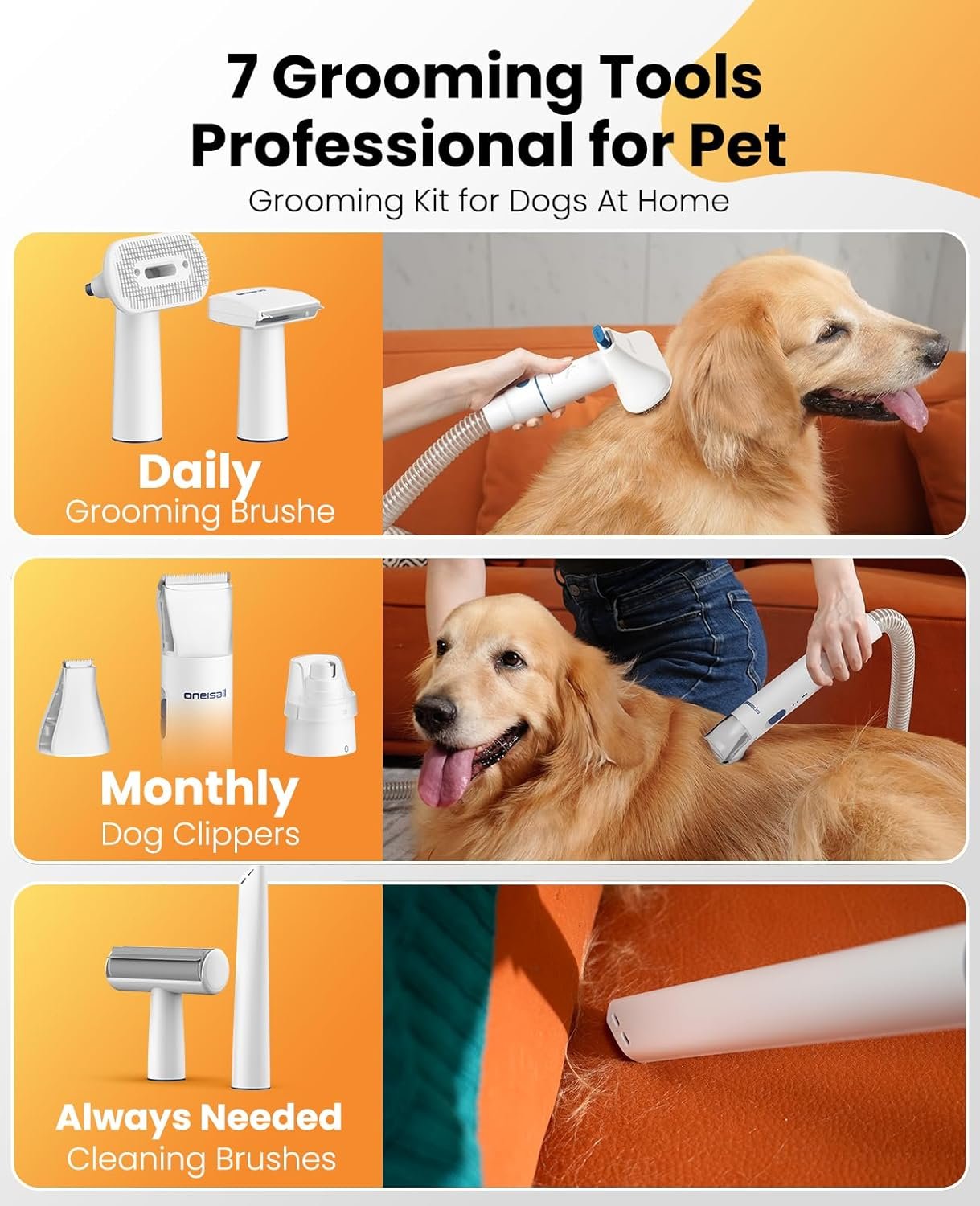 oneisall Dog Grooming Vacuum, 13000Pa Powerful 3L Dust Cup Pet Vacuum with Clipper Nail Grinder & Shedding Brush, 7 in 1 Dog Grooming Kits, Quiet, Large Capacity 3 Suction Levels, BM3