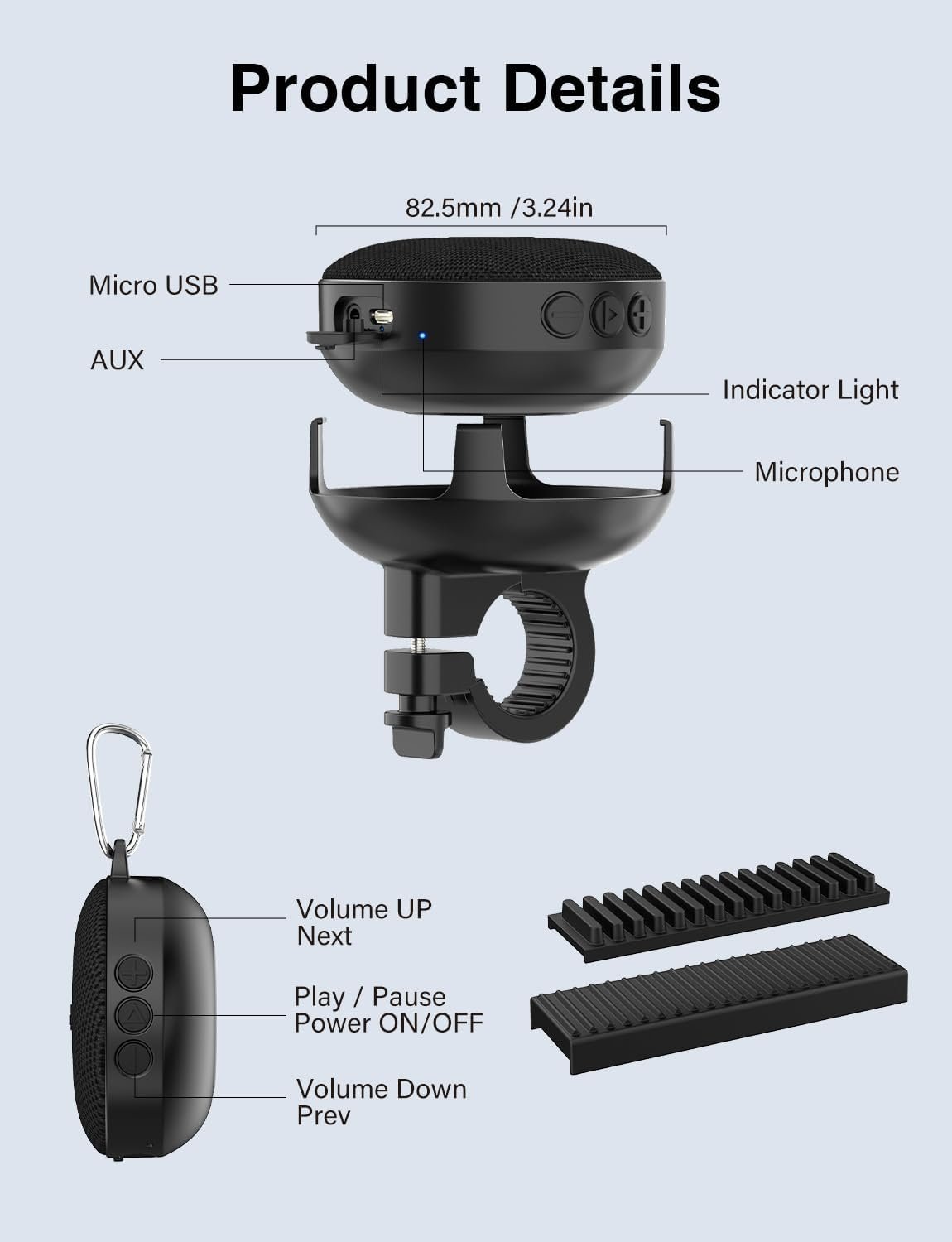 IP65 Waterproof: With IP65 waterproof rating, this bicycle speaker can be water-resistant. So it will not be influenced even in wild weather, perfect for riding, beach, pool, bathroom, and other indoor or outdoor activities