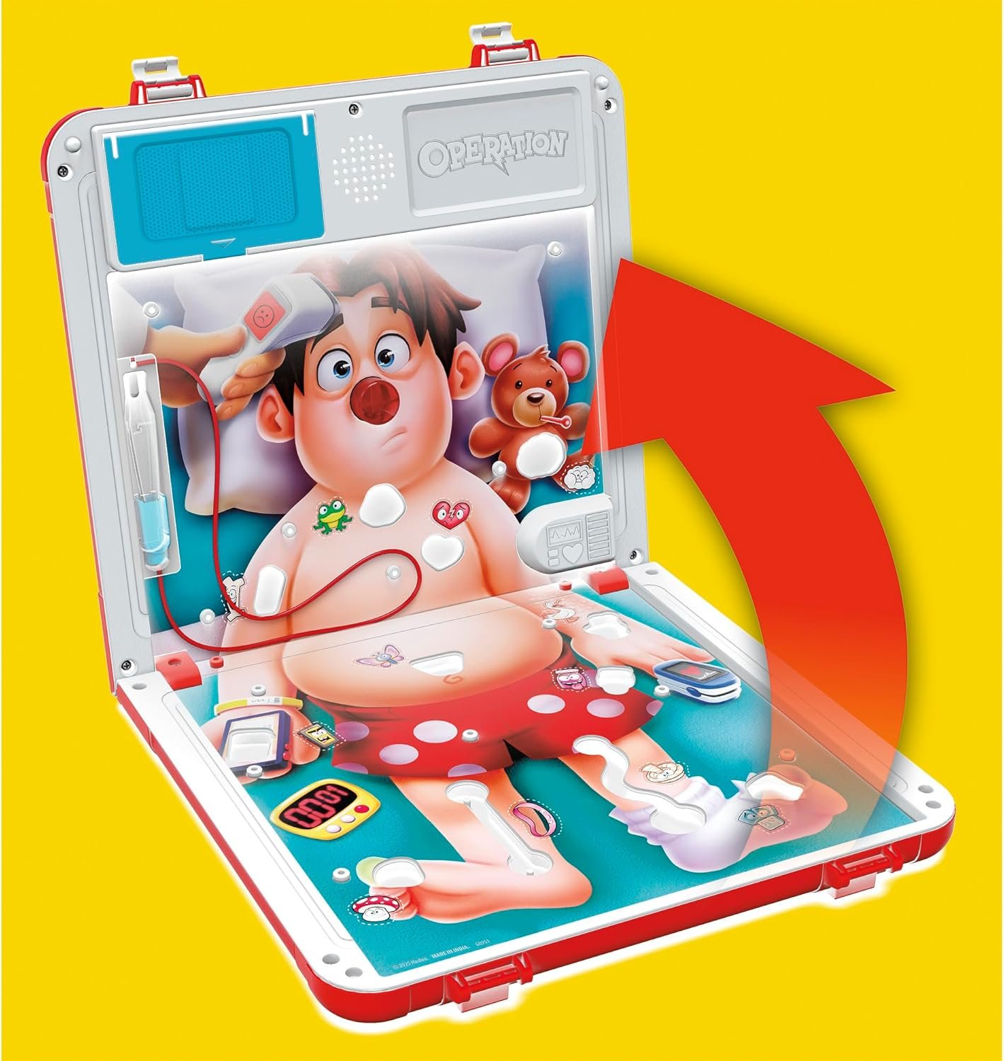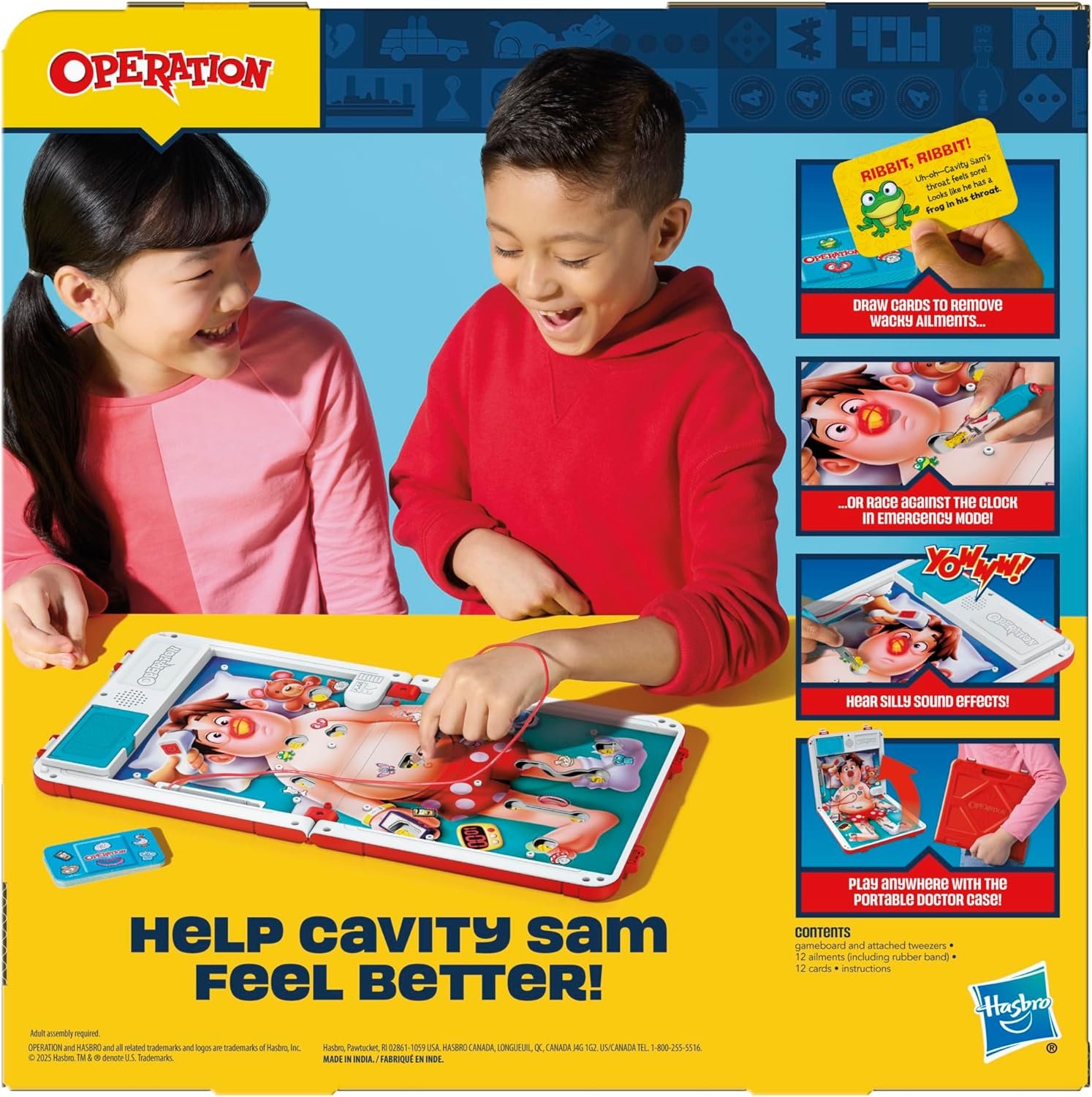 You’re—BZZZT!—basically a doctor. It’s the favorite kids board game with exciting updates! In this edition of the Operation game, choose from 2 ways to play: classic gameplay in Hospital mode or an edge-of-your-seat frenzy in Emergency mode. In Hospital mode, little doctors draw Bandage cards for wacky ailments. The suspense builds as they try to keep their hands steady while operating on Cavity Sam or—BZZZT!—his red nose lights up! In Emergency mode, the race is on to remove as many ailments as possible before time’s up. But oops! If the tweezers hit the side, Cavity Sam will burp, yelp, and make other hysterical sounds that keep kids giggling! In both modes, whoever removes the most ailments wins—and “heals” their patient. This adorable game comes in an all-in-1 carrying case with storage, so it’s a great kids travel game for anytime, anywhere play. Operation and Hasbro and all related trademarks and logos are trademarks of Hasbro, Inc.