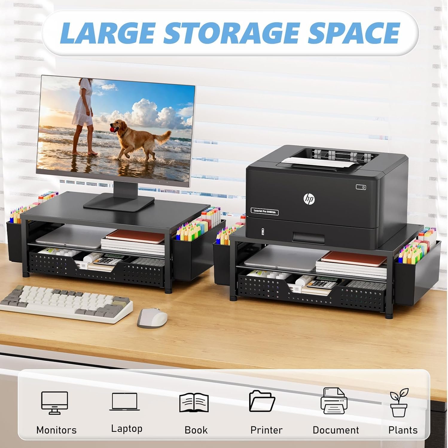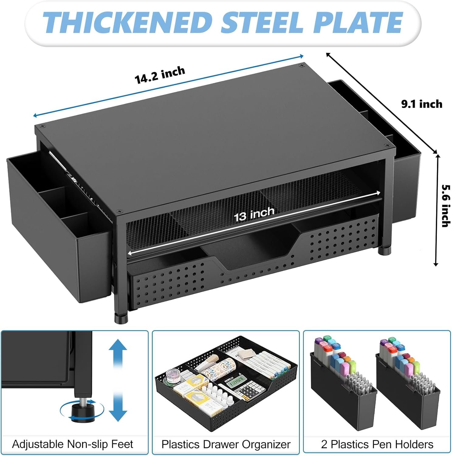 【Save Space】:This 2-Tier monitor stand with drawer and 2 hanging pen holders provides ample storage space to keep your office supplies and office desk accessories neatly organized and easily accessible, keeping your workspace tidy and improving your sense of well-being