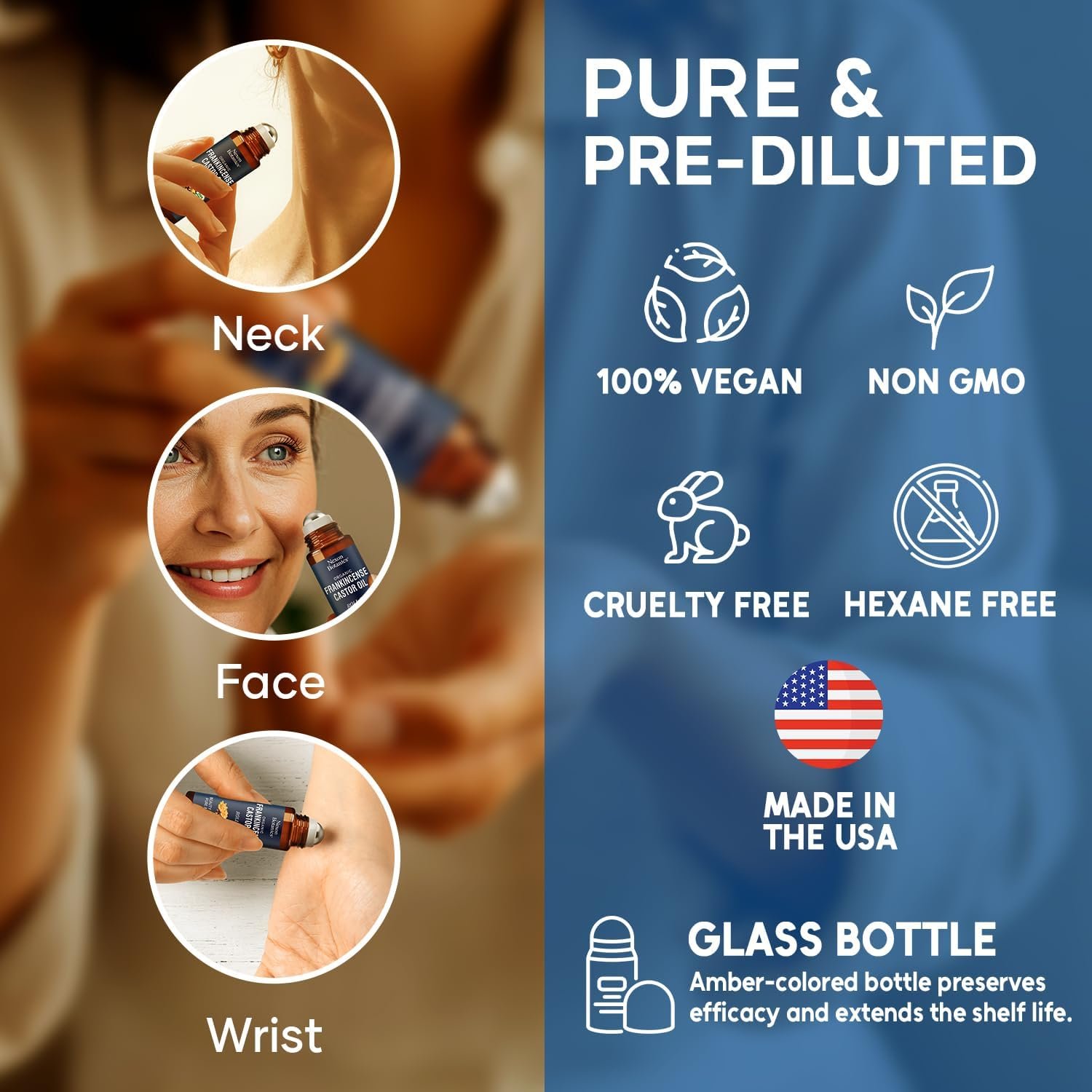 Botanical Blend for Skin: Infused with USDA Organic castor and frankincense oils to hydrate dry skin, soften fine lines, and support a natural under-eye glow.