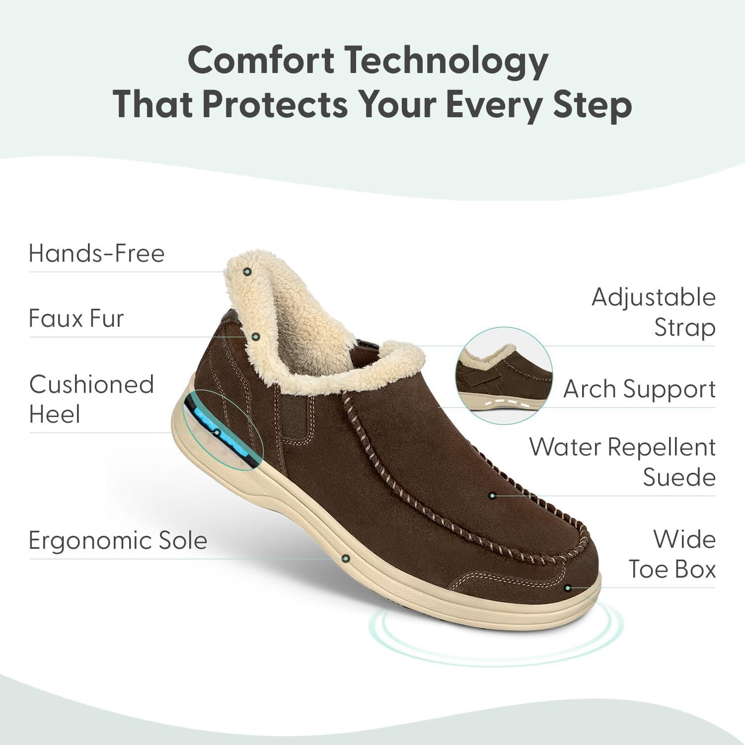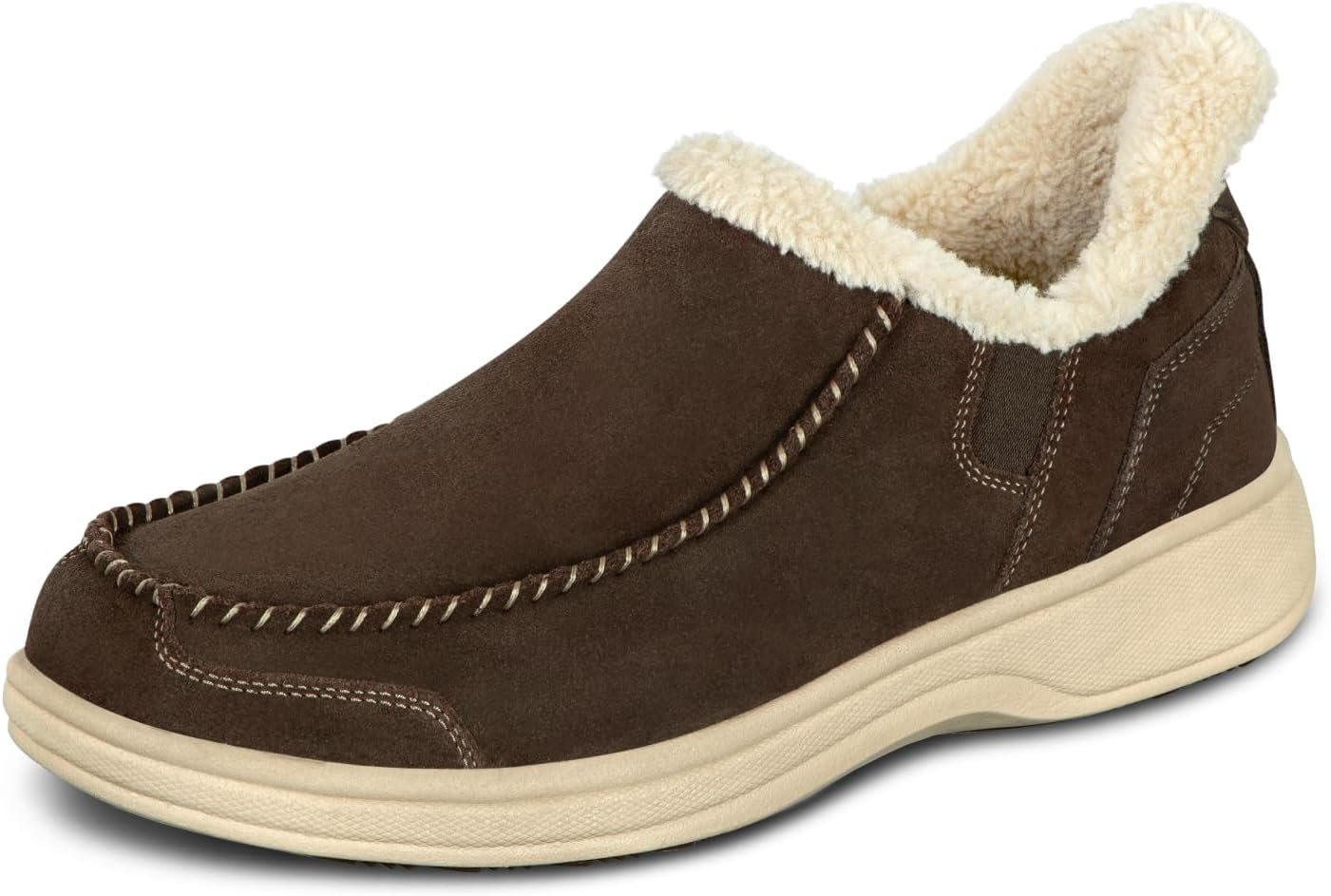 This tailored suede slipper-shoe offers full foot protection indoors and out. Put these on without bending down, thanks to our patented hands-free design. Lined completely in faux fur and featuring the supportive, easy-walking technology of the Ortho-Cushion System, Vito keeps your feet warm and well supported for more pain-free hours doing this and that, anywhere.