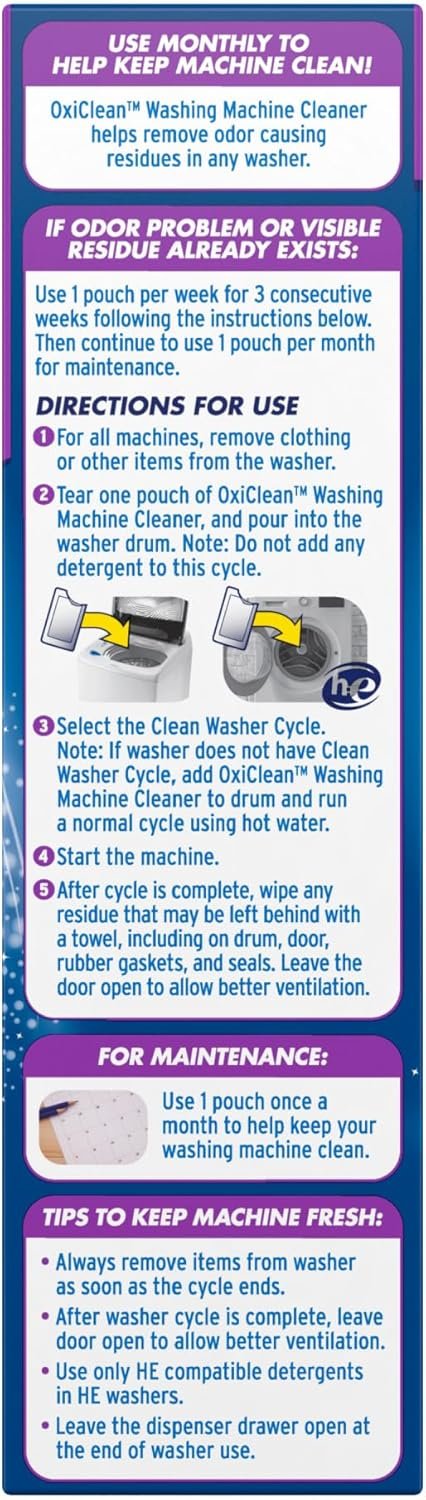 Includes: One 4 count box of OxiClean Washing Machine Cleaner with Odor Blasters to supercharge your washing machine cleaning