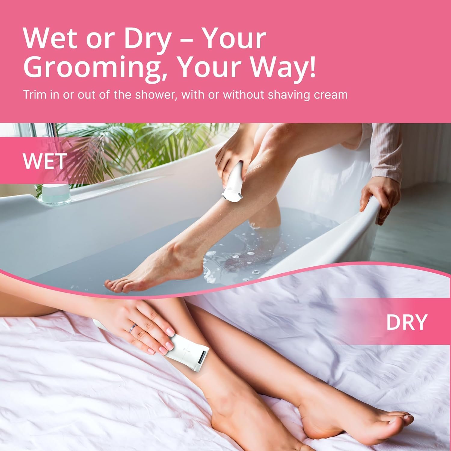 Our water-resistant functionality allows for comfortable hair removal wet or dry, with or without shaving cream, anytime, anywhere!