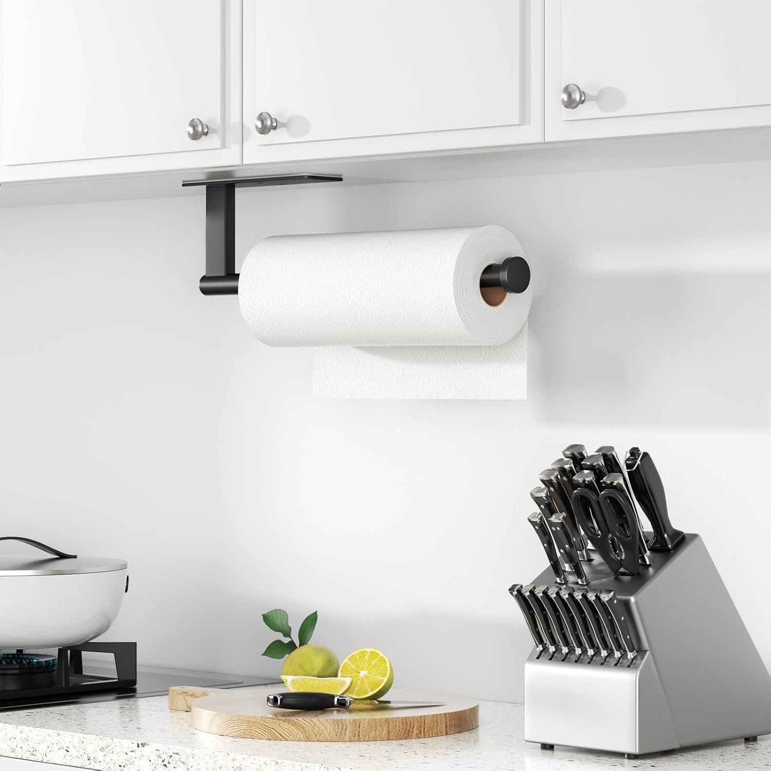 Paper Towel Holder Under Cabinet – Stainless Steel Paper Towel Holder Wall Mount, Self-Adhesive or Drilling, Matte Black Towel Rack for Kitchen Organization and Storage, Kitchen Paper Roll Holder