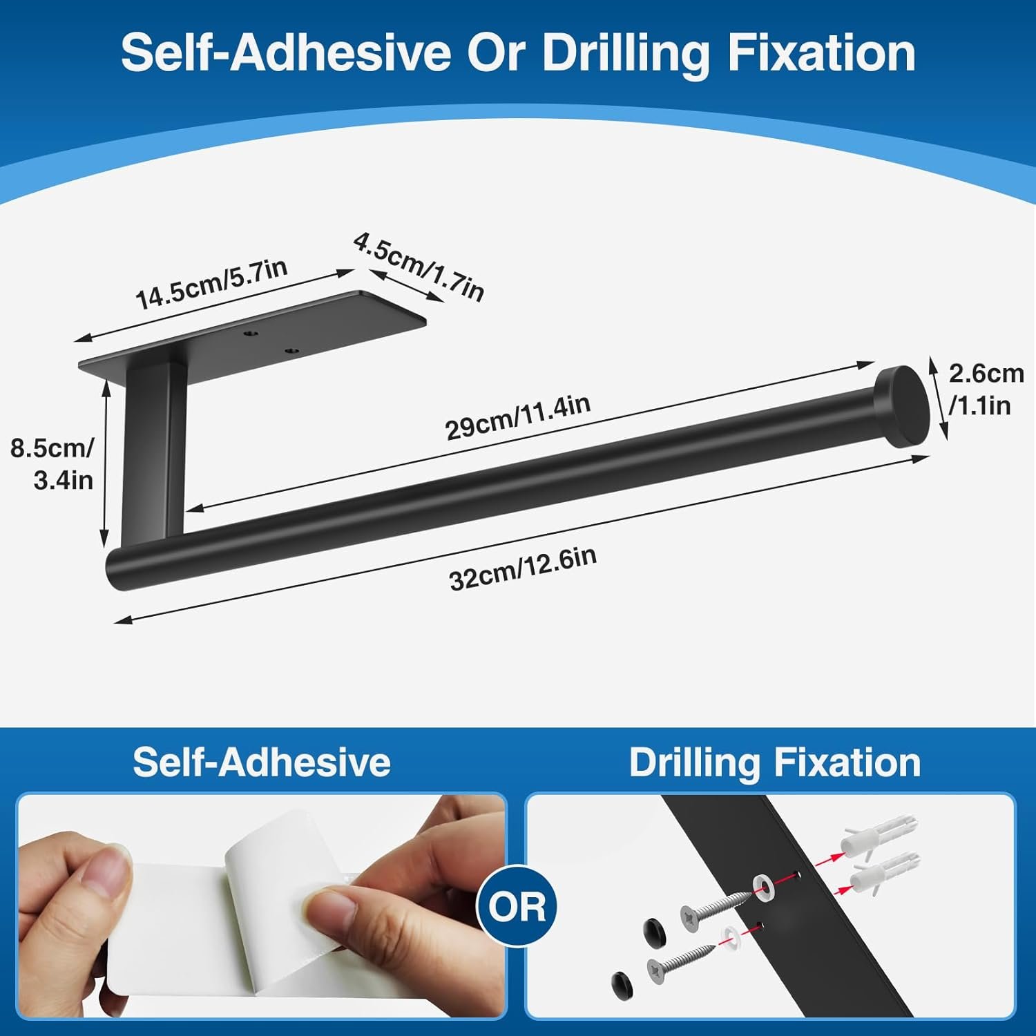 ✅【2 Installation Ways】Paper towel holder wall mount, super easy to install. Self-adhesive or drilled, as you choose. Note: If you choose self-adhesive installation, make sure the wall is smooth and follow the instructions.