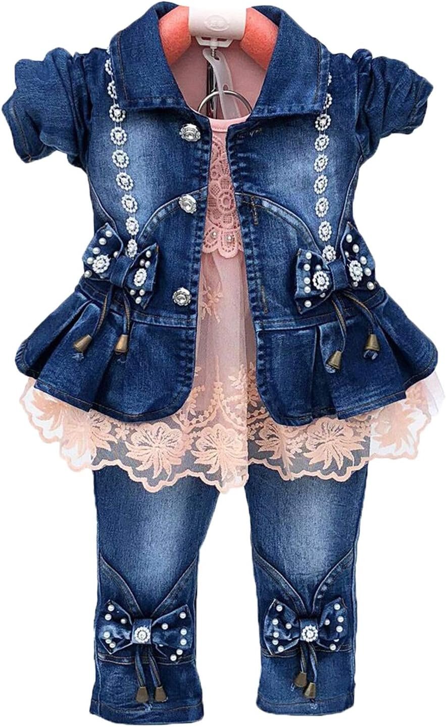Peacolate Spring Autumn Little Girls Clothing Set 3pcs Long Sleeve T-Shirt Denim Jacket and Jeans