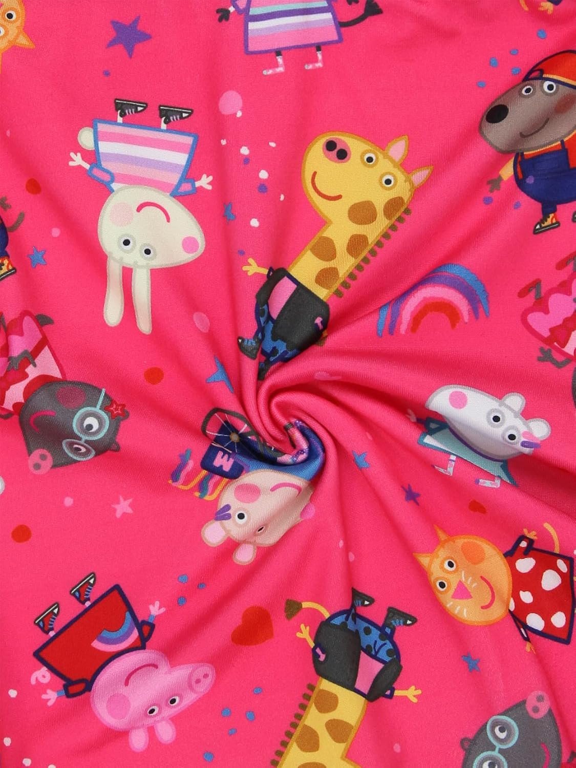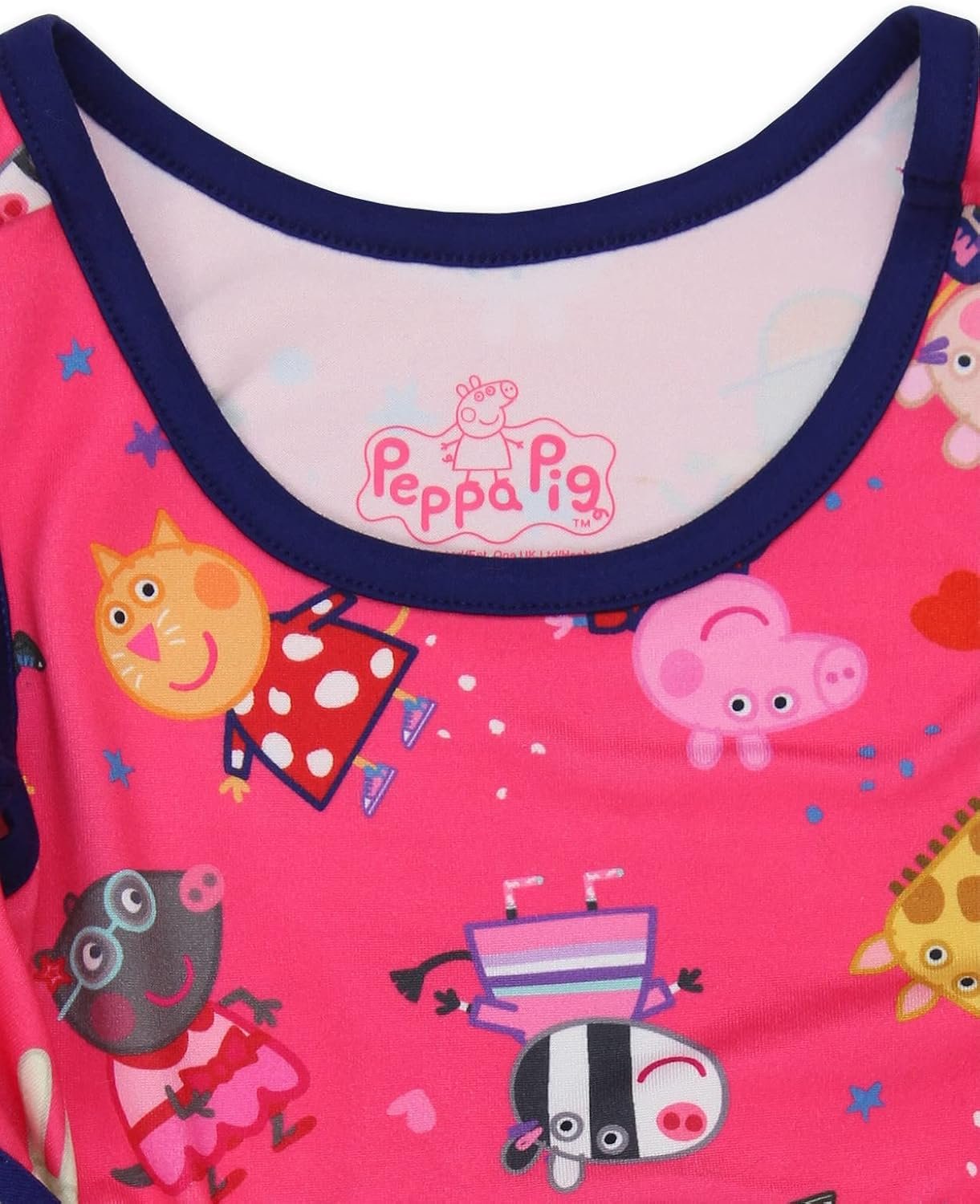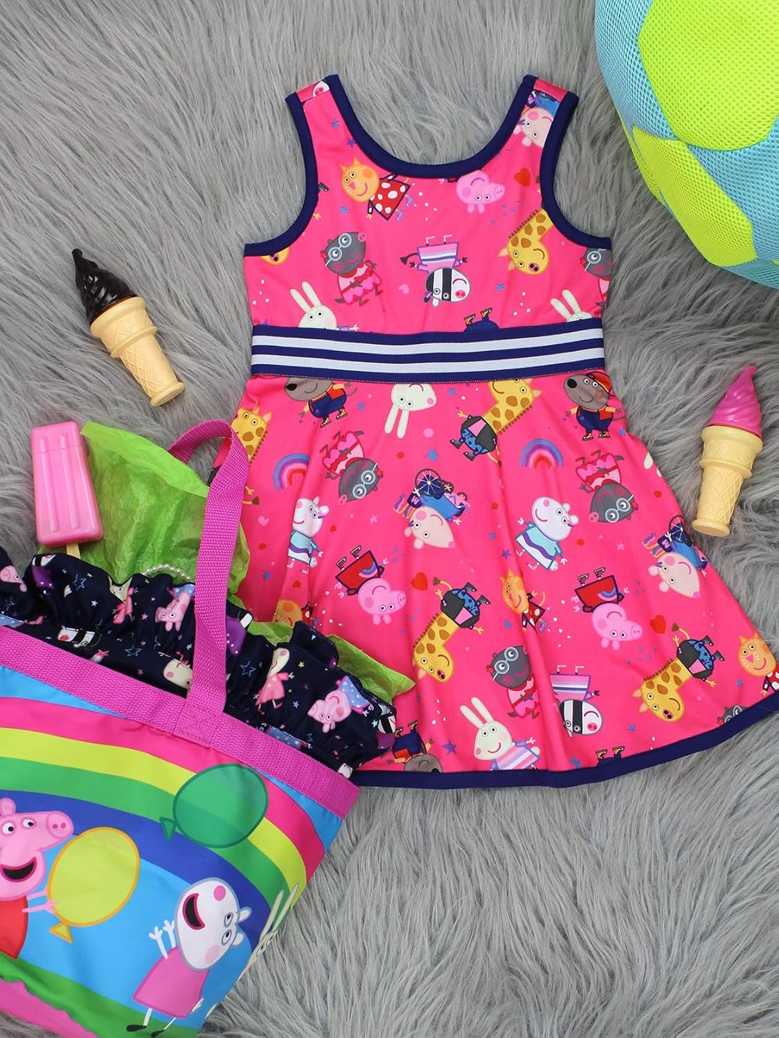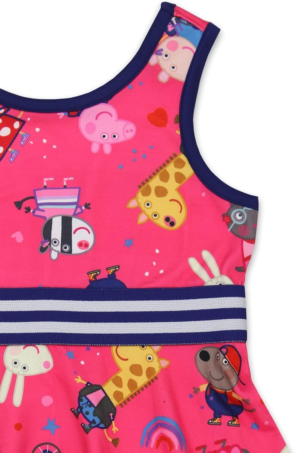 Get your little darling ready for any day in this super cute toddler girl’s Peppa Pig fit and flare dress! This adorable dress includes a buttery soft polyester fabric, a stretchy elastic waistband that is lined on the inside, a tank style top, and super cute sublimated graphics. This adorable Peppa Pig dress is cut on the bias for added twirlability and includes a heat seal tag. This dress is great for any season. Pair this sleeveless dress with her favorite leggings and sweater in the winter, or rock this cute dress with her favorite hat and sandals in the summer. This super cute dress features her favorite Peppa Pig characters including: Gerald Giraffe, Mandy Mouse, Zoë Zebra, Suzy Sheep, Candy Cat, Danny Dog, Molly Mole, Rebecca Rabbit, George Pig and Peppa Pig! You can keep this cute dress casual or dress it up for special occasions like Easter, Birthdays, or Christmas! This stylish Peppa dress is available in toddler sizes 2T, 3T, 4T, and 5T.