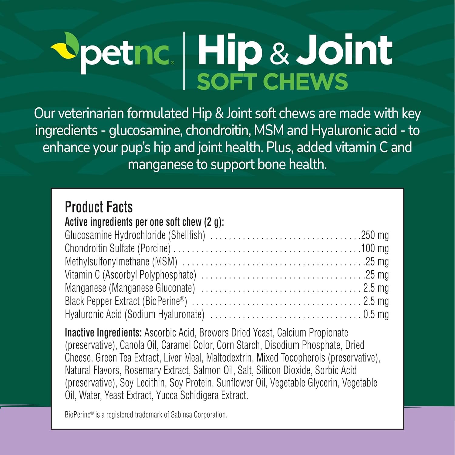 Petnc Hip & Joint Soft Chews offer a thoughtfully crafted solution for maintaining your dog’s hip and joint health. Formulated by veterinarians, these chews contain essential ingredients like glucosamine, chondroitin, MSM, and hyaluronic acid, which are known for their supportive role in joint care. Additionally, vitamin C and manganese encourage overall bone wellness, making these chews a well-rounded choice for dogs of various life stages.
