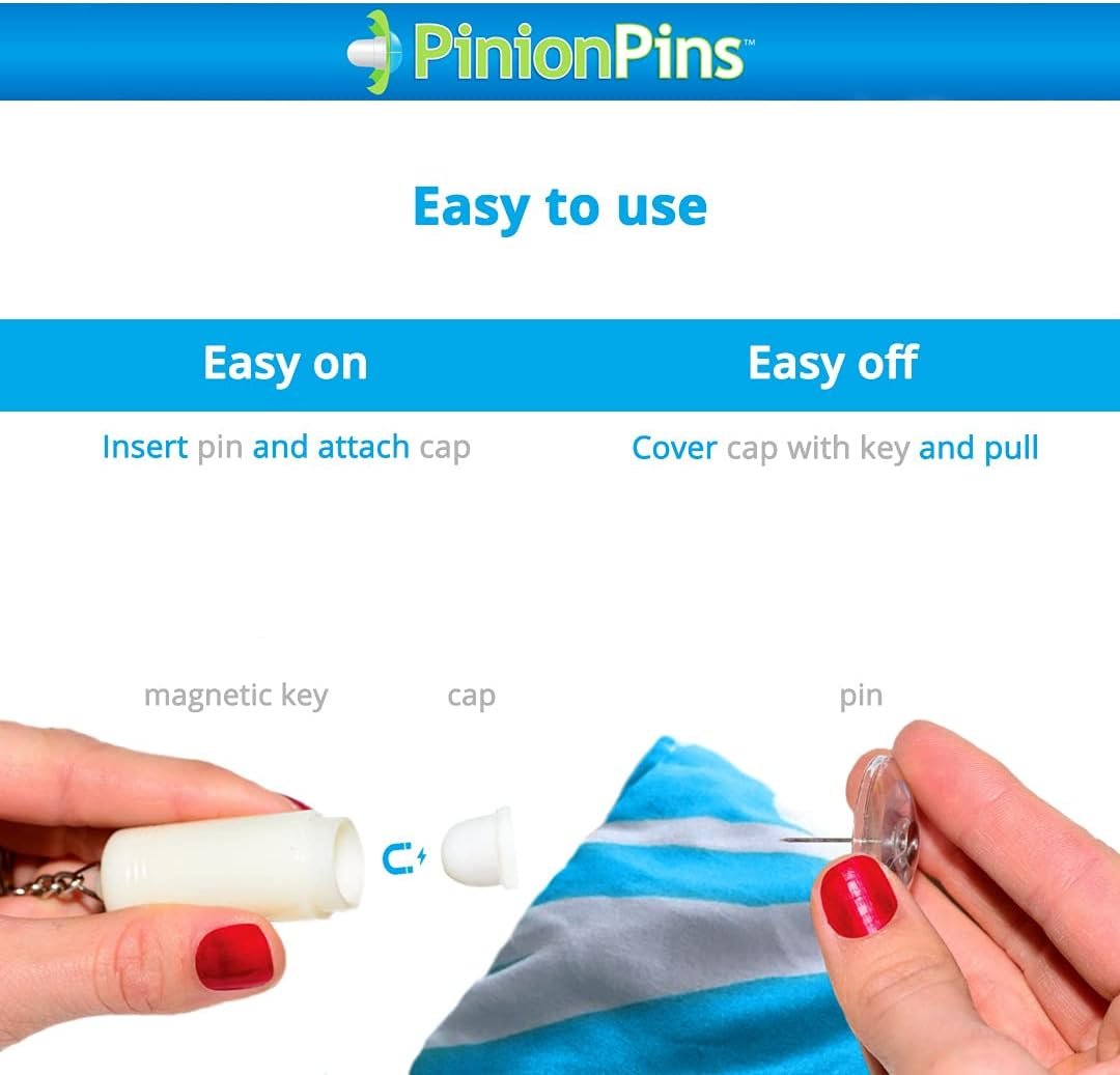 EASY RELEASE DESIGN – Most Duvet fasteners are difficult to remove. Pinion Pins include a magnetic key for easy removal! Simply use the included magnetic key to remove the pin back. Our Pinion Pins have a unique design, protected under patent #10,136,704.