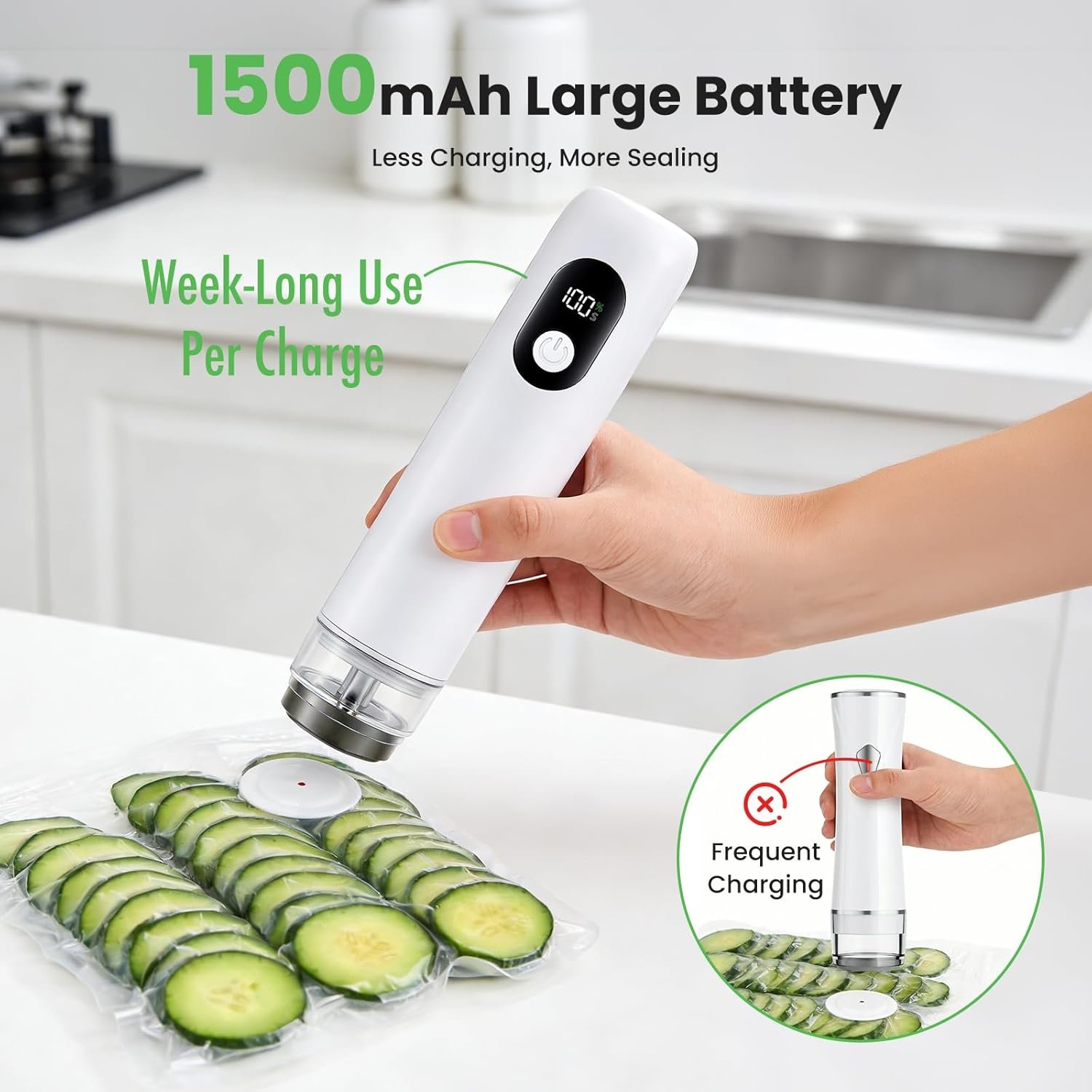 Fast USB-C Charging: Power up with the convenience you expect from modern devices. Equipped with a USB-C charging port, this handheld vacuum sealer can be quickly recharged from your laptop, solar power bank, or car adapter. The built-in 1500mAh battery provides ample power for multiple sealing sessions, so you’re always ready to pack up leftovers after a picnic or seal a spontaneous farmers market find.