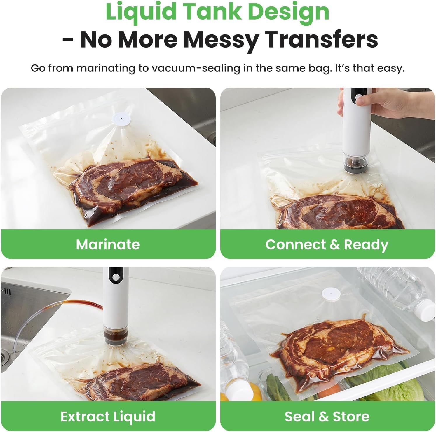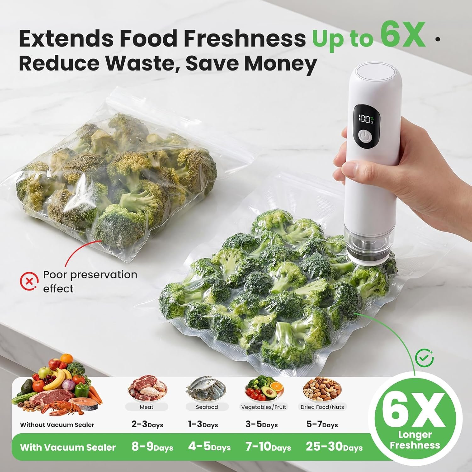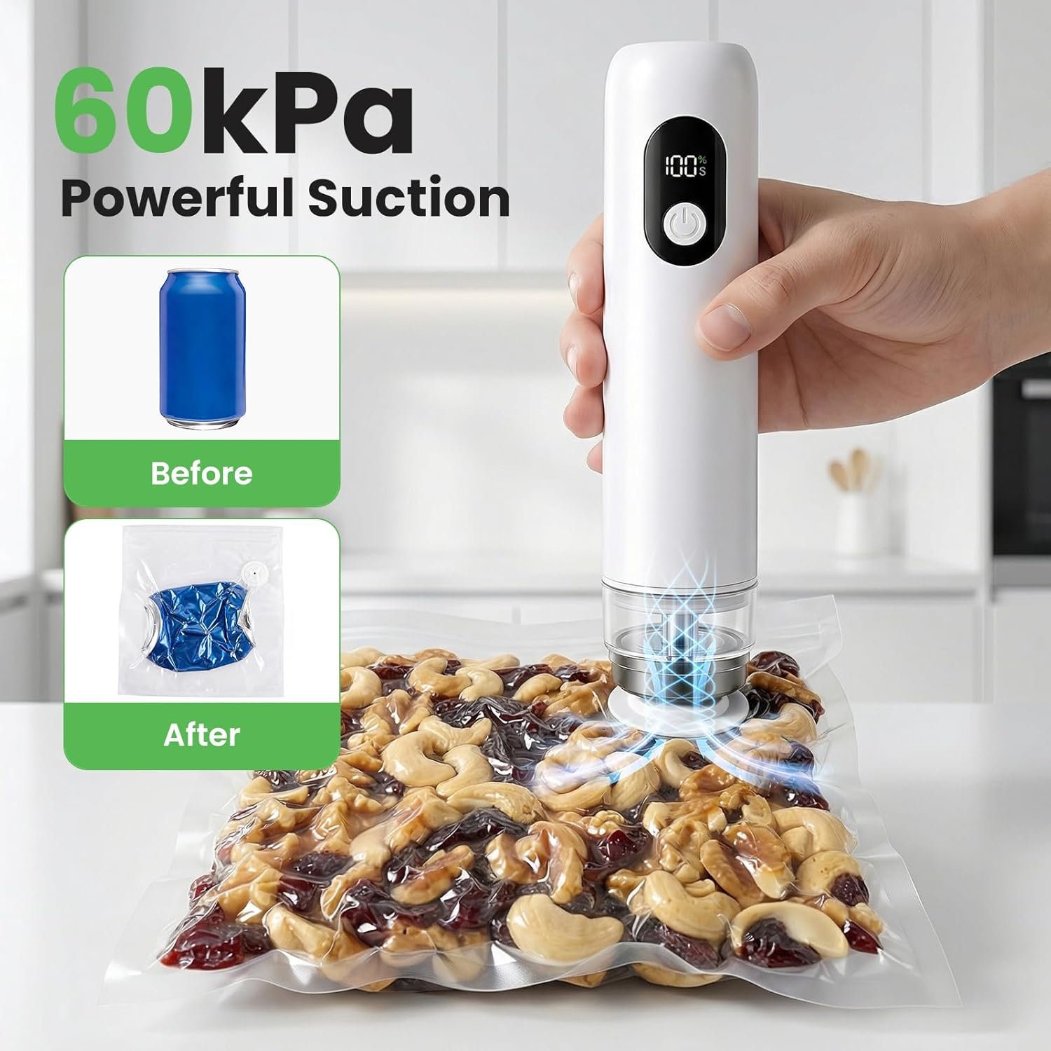 Powerful Suction Anywhere: Don’t let its small size fool you. This portable vacuum sealer packs a punch with 60kPa of suction power, delivering professional-grade results whether you’re at home or on the road. Use it with the included reusable bags to quickly marinate meats for a campsite BBQ or keep your hiking snacks perfectly crisp, all powered by its long-life battery.