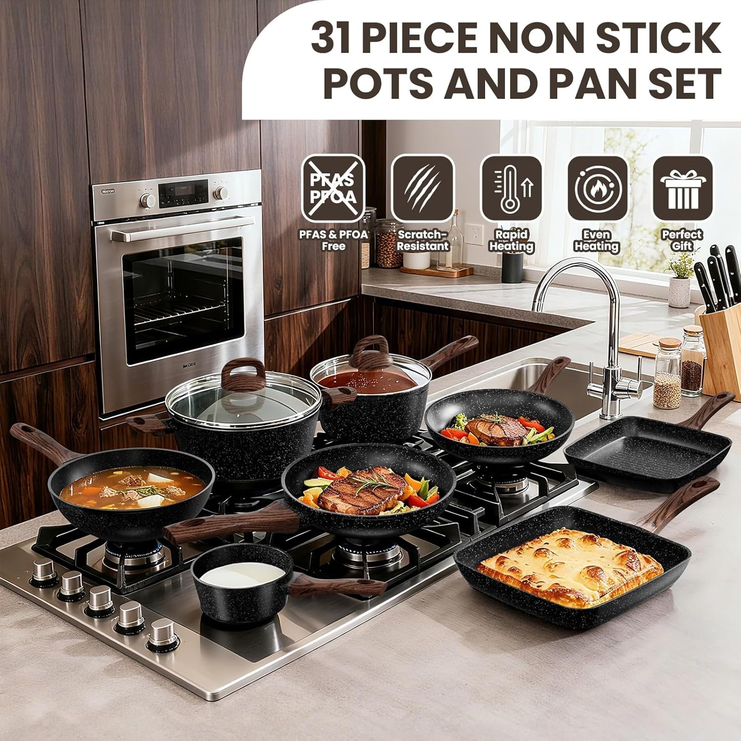 Pots and Pans Set Non Stick, 31 Piece Kitchen Induction Cookware & Bakeware Set, Nonstick Kitchen Cooking Pans Set with Frying Pans Set Grill Pan Saucepan Baking Sheet & Utensils, PFOA Free