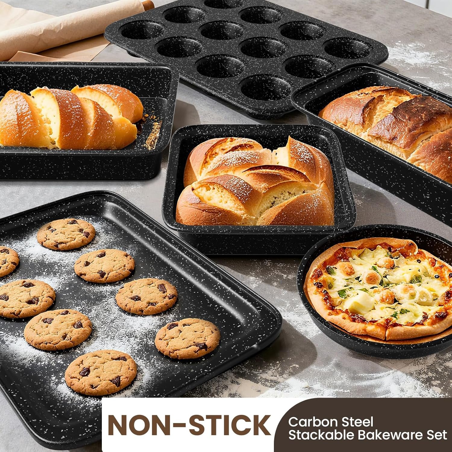 【Nonstick Stackable Bakeware Set】This versatile 7-piece bakeware set is crafted from durable carbon steel and features a scratch-resistant nonstick coating for flawless food release and easy cleanup. Its space-saving, stackable design maximizes cabinet space, helping to keep your kitchen organized. Including essential pieces like baking sheets and a muffin pan, it accommodates a wide variety of recipes—from cookies to cakes—making it the perfect baking set for cooking enthusiasts.