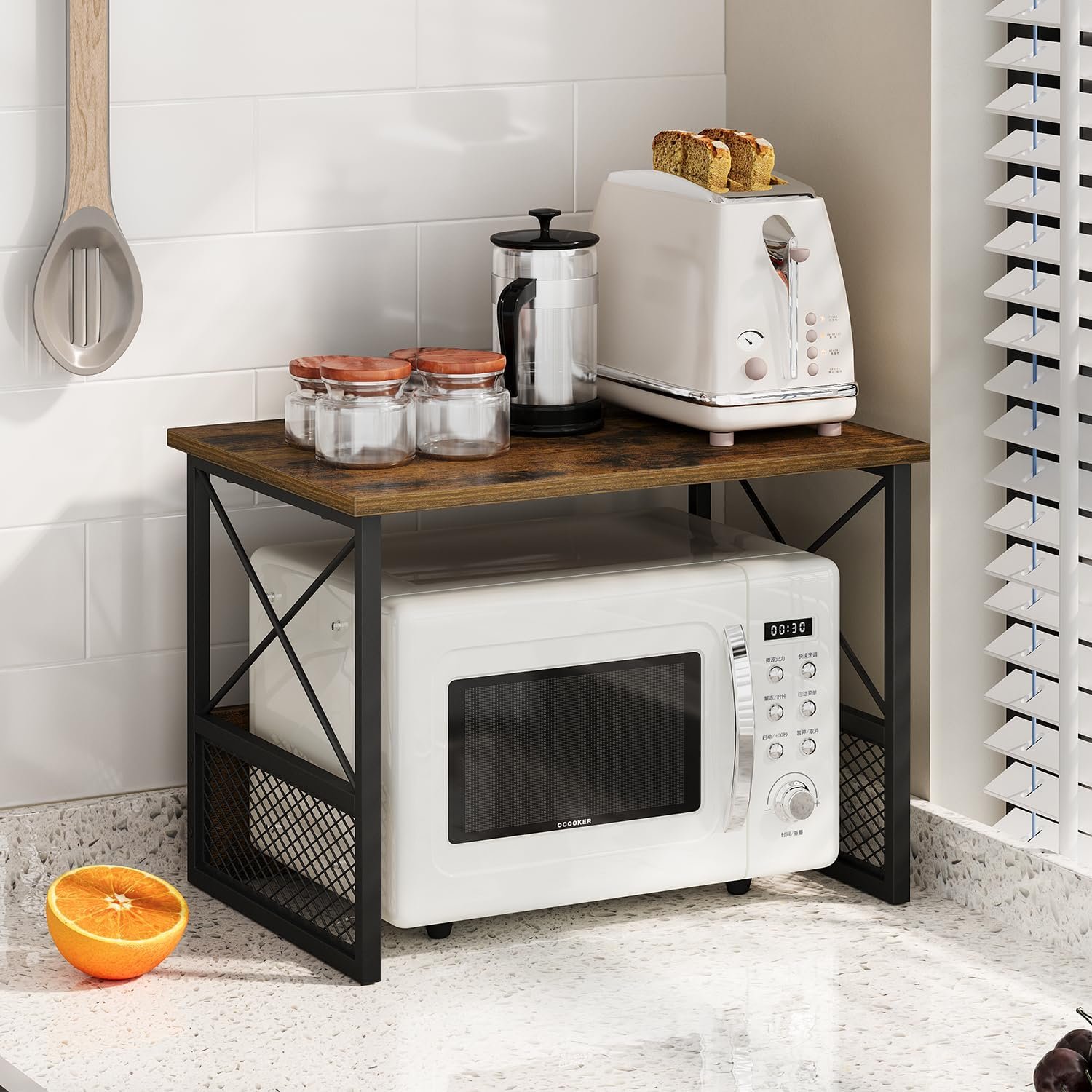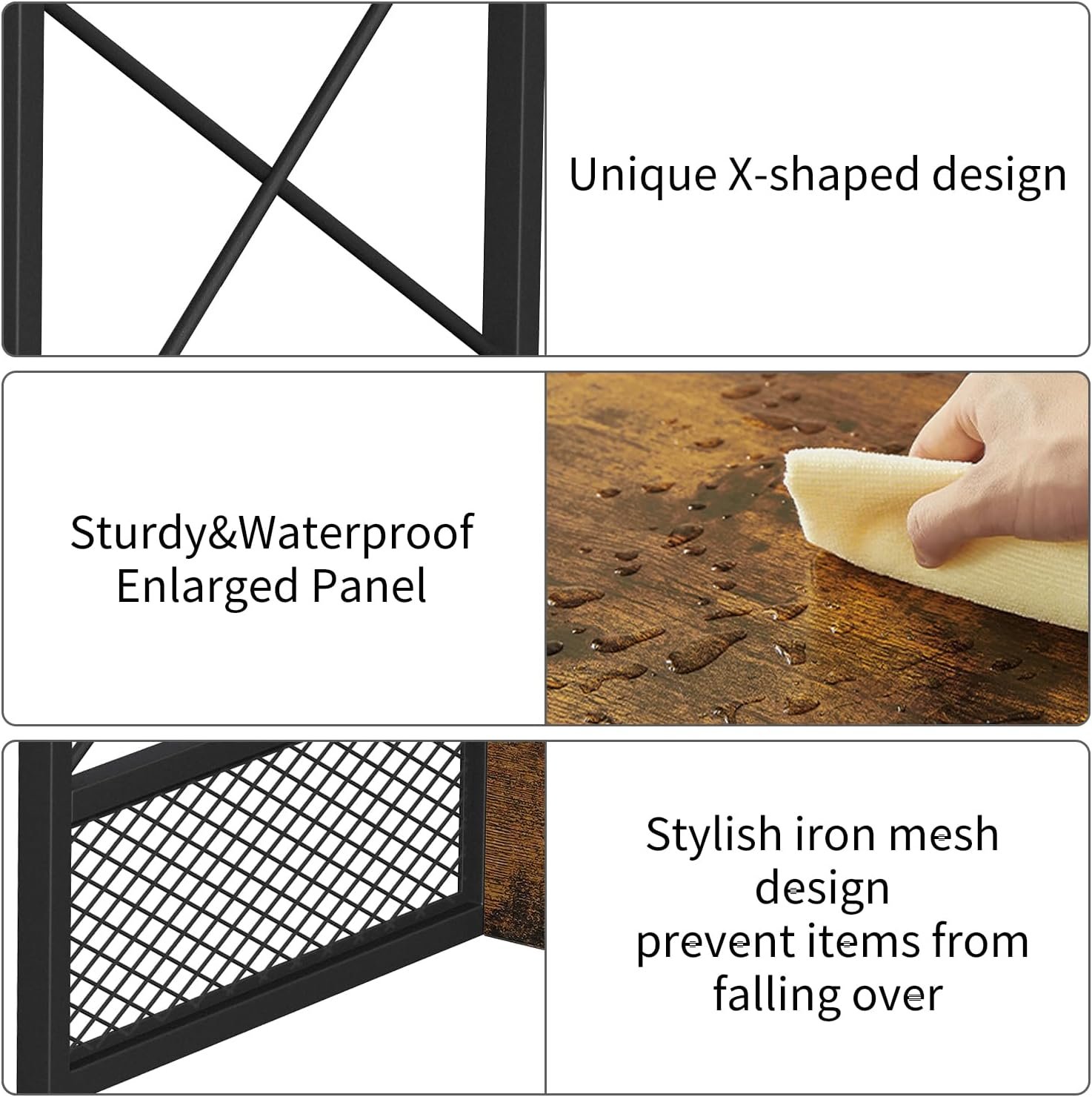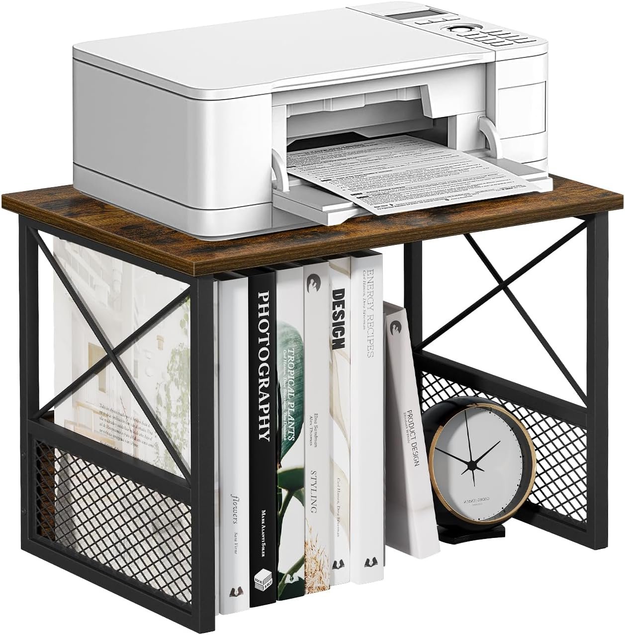 X-shape&Iron Mesh Design:The X-shaped support design between iron pipes significantly improves the printer shelf’s stability. The bottom is equipped with diamond-shaped iron mesh. These designs not only prevent papers, files and documents from falling but also adds a touch of modern elegance to the overall look.