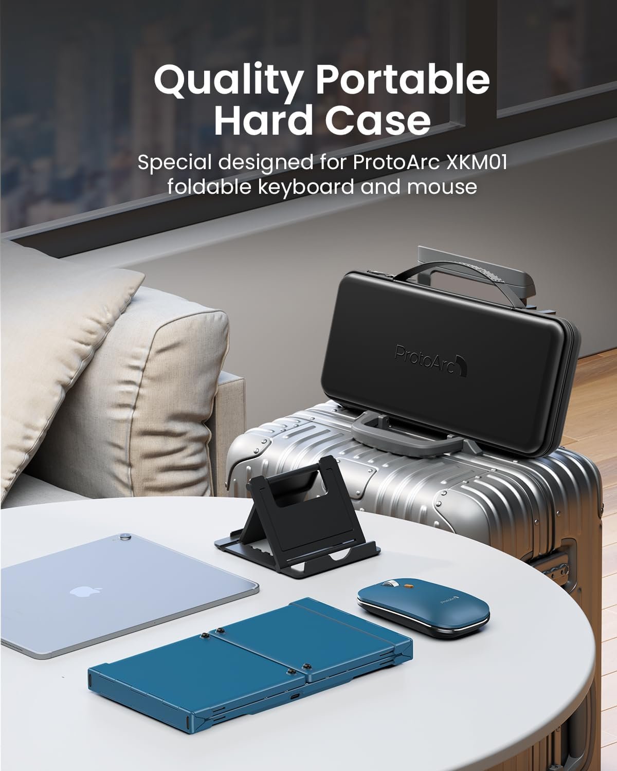 Travel-Ready All-in-One Kit: Includes a carrying hard case (12 x 5.55 x 1.6 in) with a foldable stand for 4-11” iPads/tablets. Internal aluminum hinges survive 10,000+ folds, tougher for frequent trips. Unfold and work instantly, zero setup time