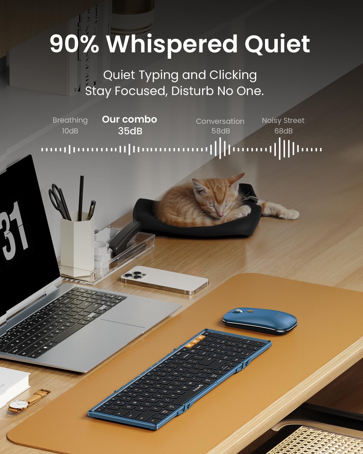 Work Quietly Anywhere: Our foldable bluetooth keyboard features whisper-quiet scissor switches and low-profile keys, paired with a noise-reducing mouse to deliver library-level silence. Perfect for meetings, coffee shops, and flights – enhances focus by 50% without disturbing others