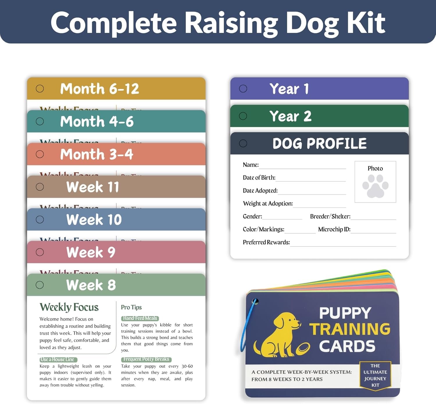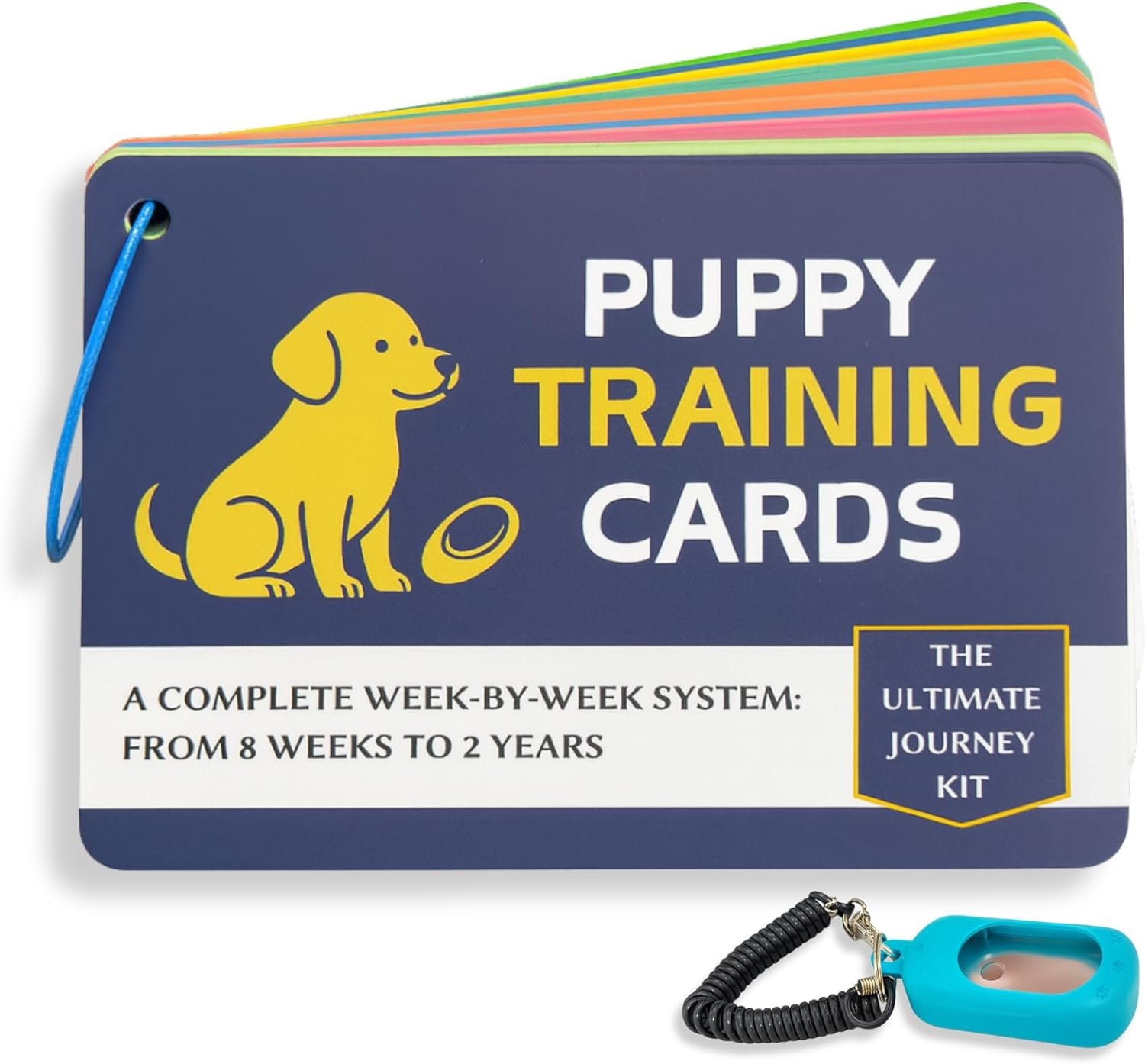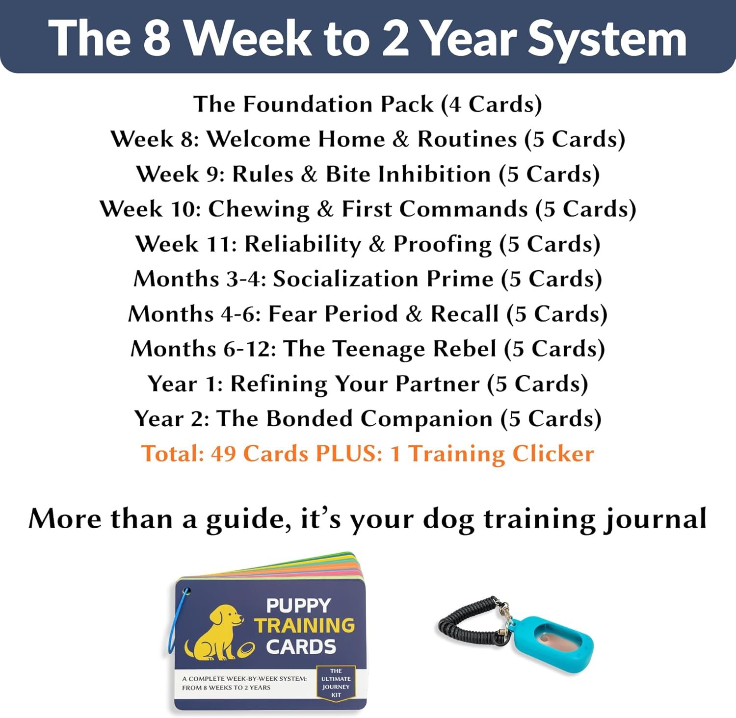 Puppy Training Cards – Complete Raising Dog Kit with Clicker – Replaces Dog Training Book & Journal – 50 Stage by Stage Guide Cards (8 Weeks to 2 Years)