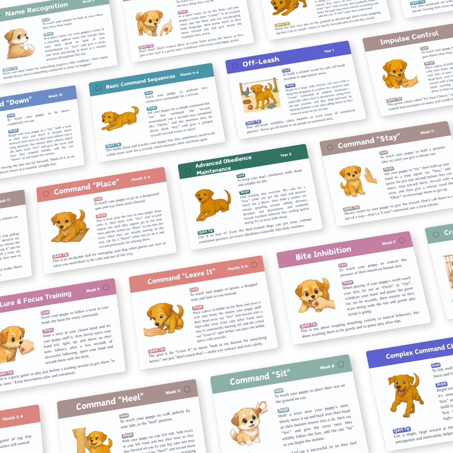 Stop the endless search & forget dense books. This 50-card puppy training system replaces your old dog training book. Get clear, stage by stage visual guides for everything: Housetraining, Crate Training, Biting, & Basic Cues. No more “walls of text”—just simple, actionable steps.