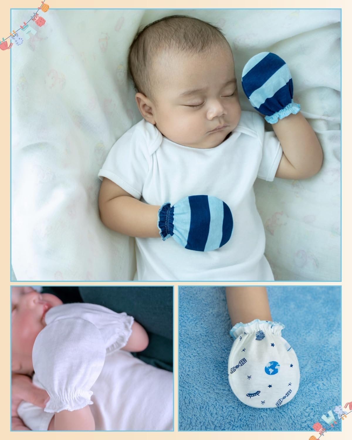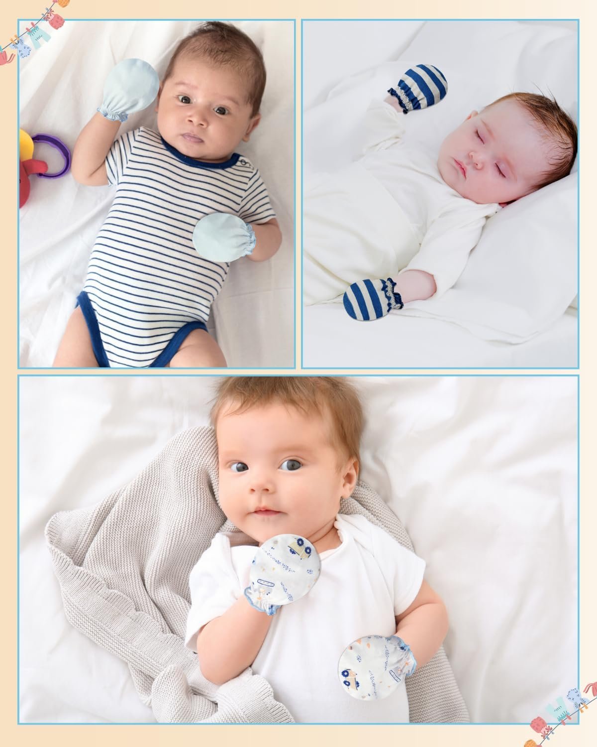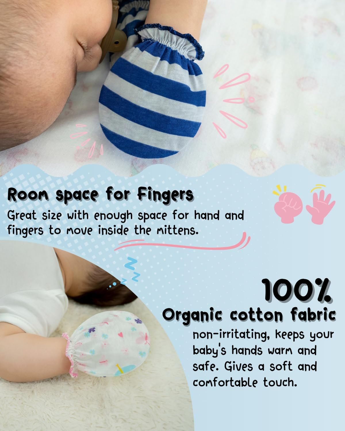 Made from 100% organic cotton, these baby mittens newborn are soft, breathable, and gentle on delicate skin. The baby mittens 0–6 months help prevent scratches and keep tiny hands cozy all day.