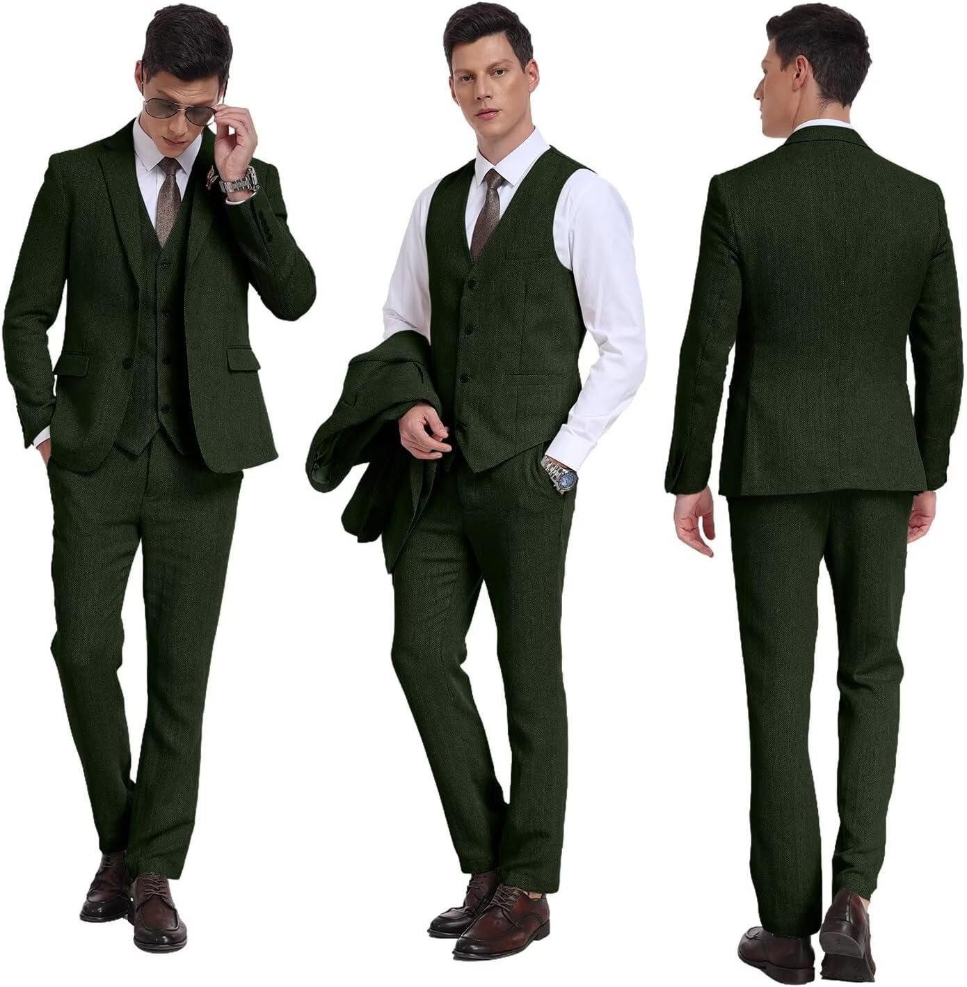 Retro 3 Piece Suit Tweed Herringbone Men’s Suits Slim Fit Groom Tuxedos Set Prom Brown Grey Jacket Blazer Vest Pants