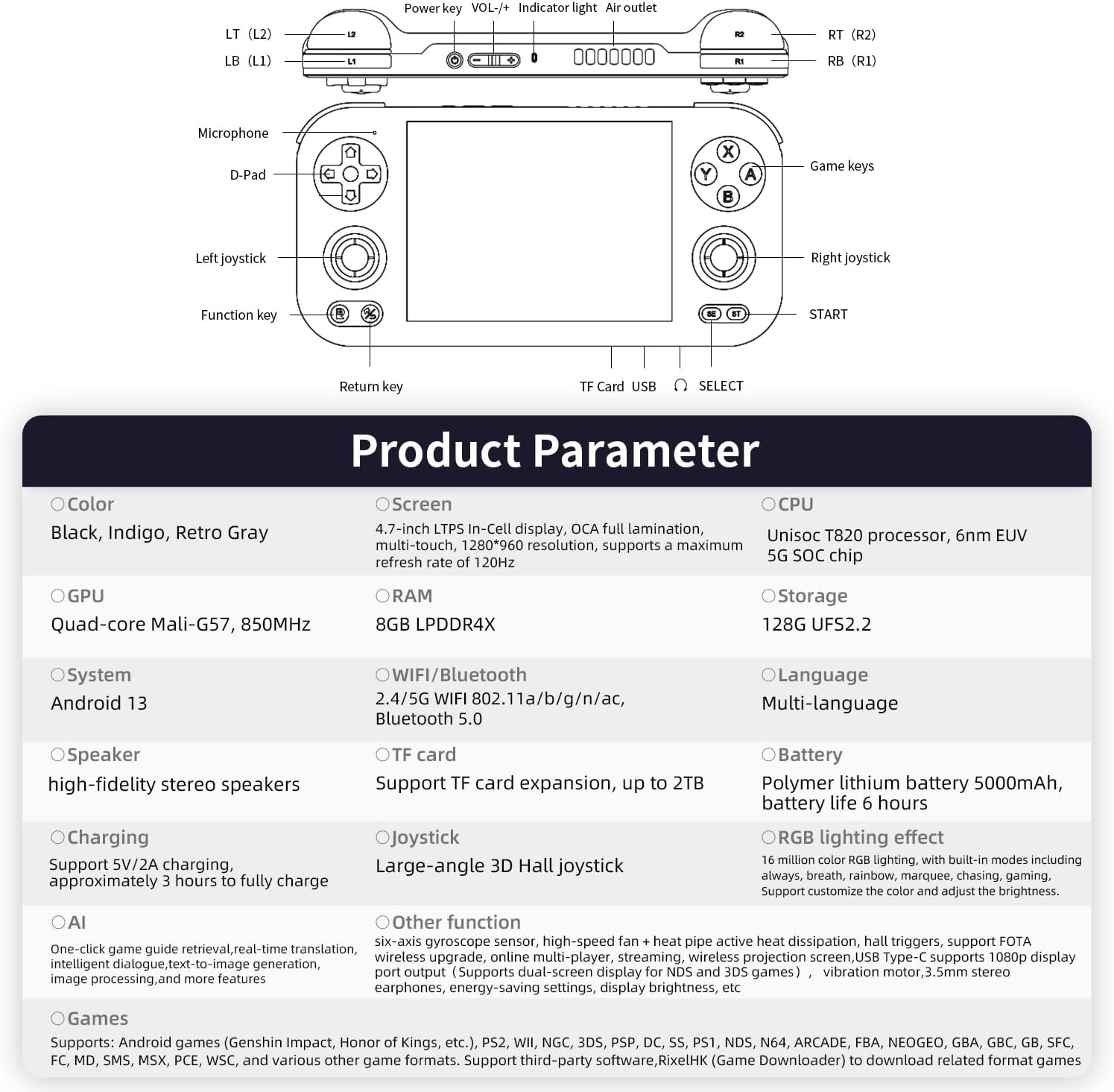 【System Configuration】: Latest RG series product, the RG 476H portable game console. Classic horizontal design handheld game console, CPU: Unisoc T820 processor, with 6nm EUV 5g SOC chip, built-in Octa-core 1*A76@2.7GHz+3*A76@2.3GHz+4*A55@2.1GHz, GPU Quad Core Mali-G57 850mhz It features 8gb LPDDR4X RAM, 128GB ufs2.2 storage and is equipped with Android 13 system.