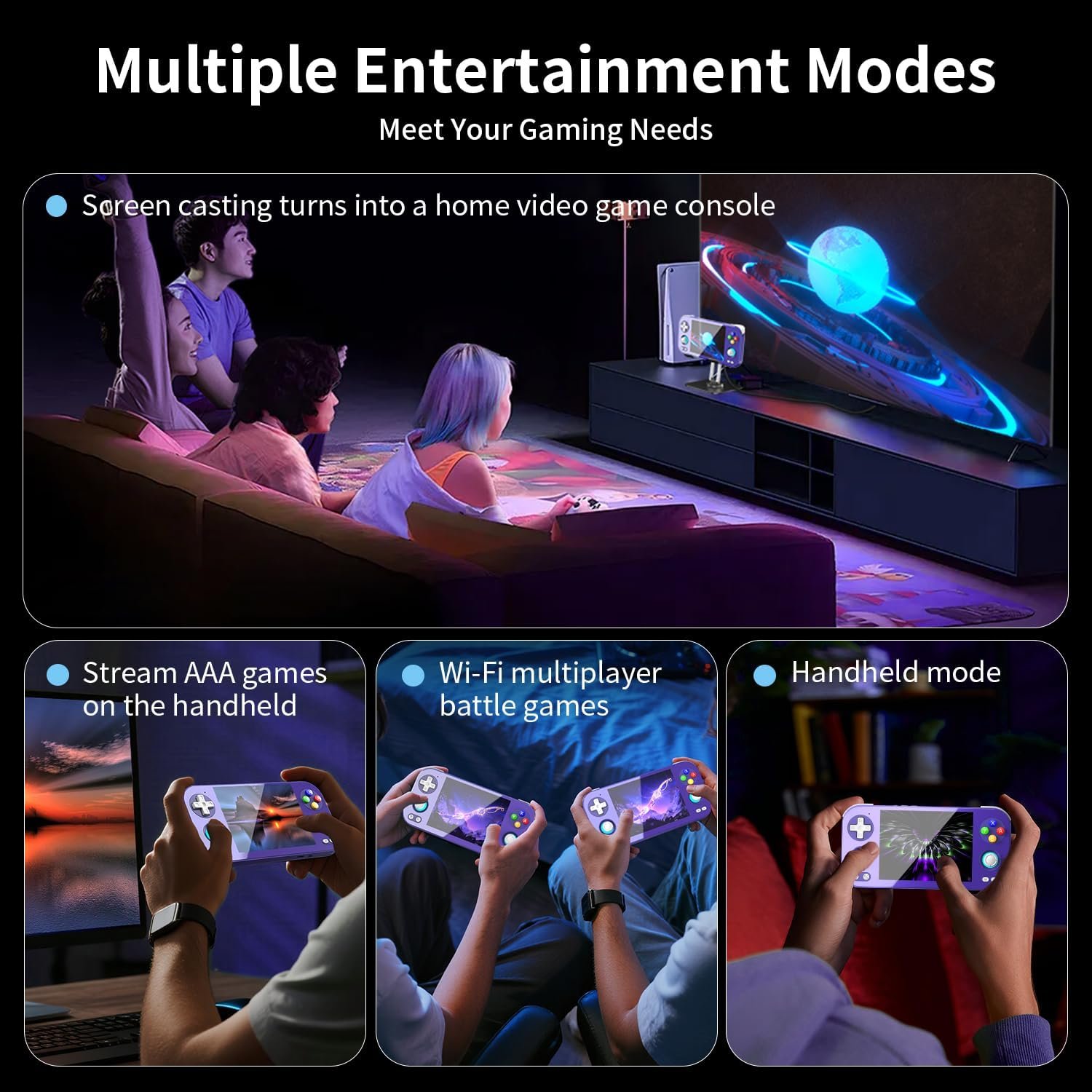 【Other Functions + Memory 】 USB-c supports 1080p DisplayPort output (dual-screen display for NDS/ 3ds games), HDMI output, and also supports multiple languages. It also supports external expansion TF cards. Maximum 2tb. Vibration motor, compatible with 3.5mm stereo headphones; Energy-saving Settings, joystick light control, brightness display and other functions.