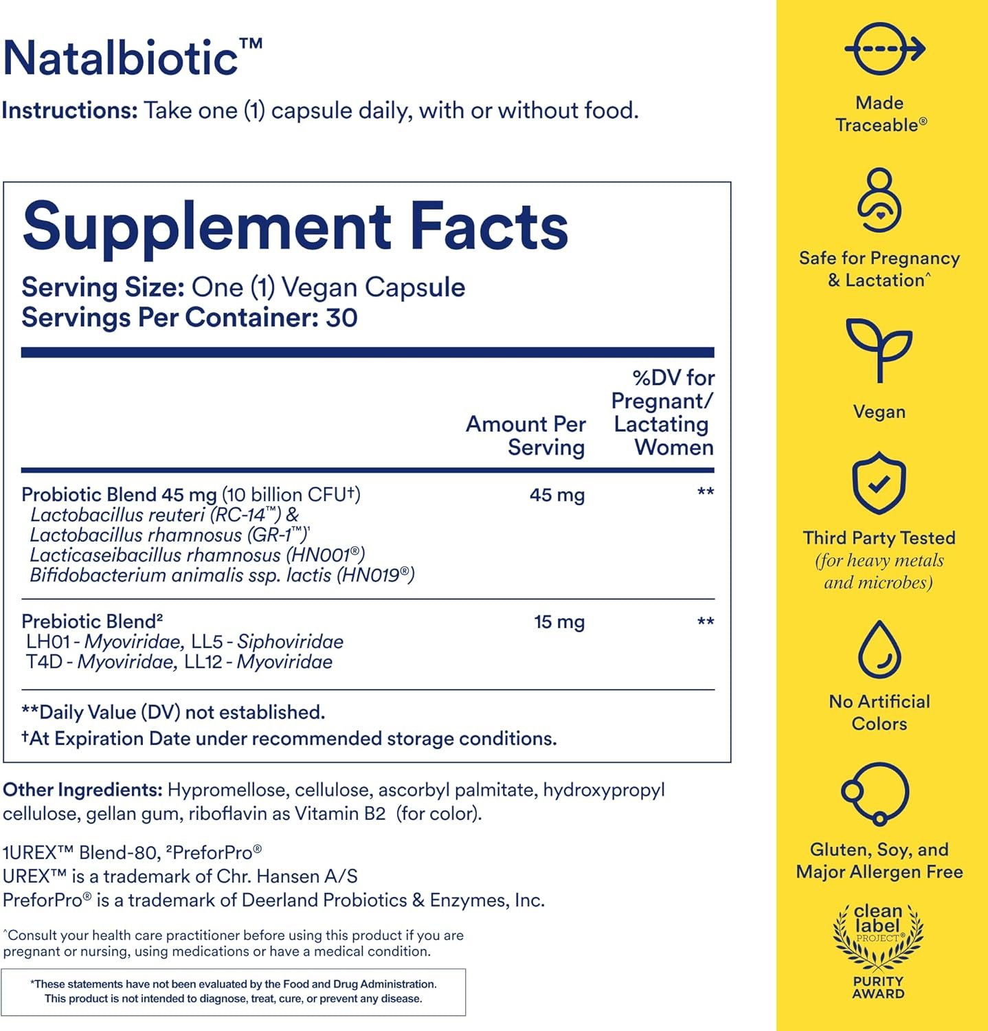 If you’re pregnant or postpartum and looking for pre and postbiotic support, Natalbiotic may be right for you. As with starting any new dietary supplement, we recommend checking with your healthcare provider to make sure it fits your needs.*