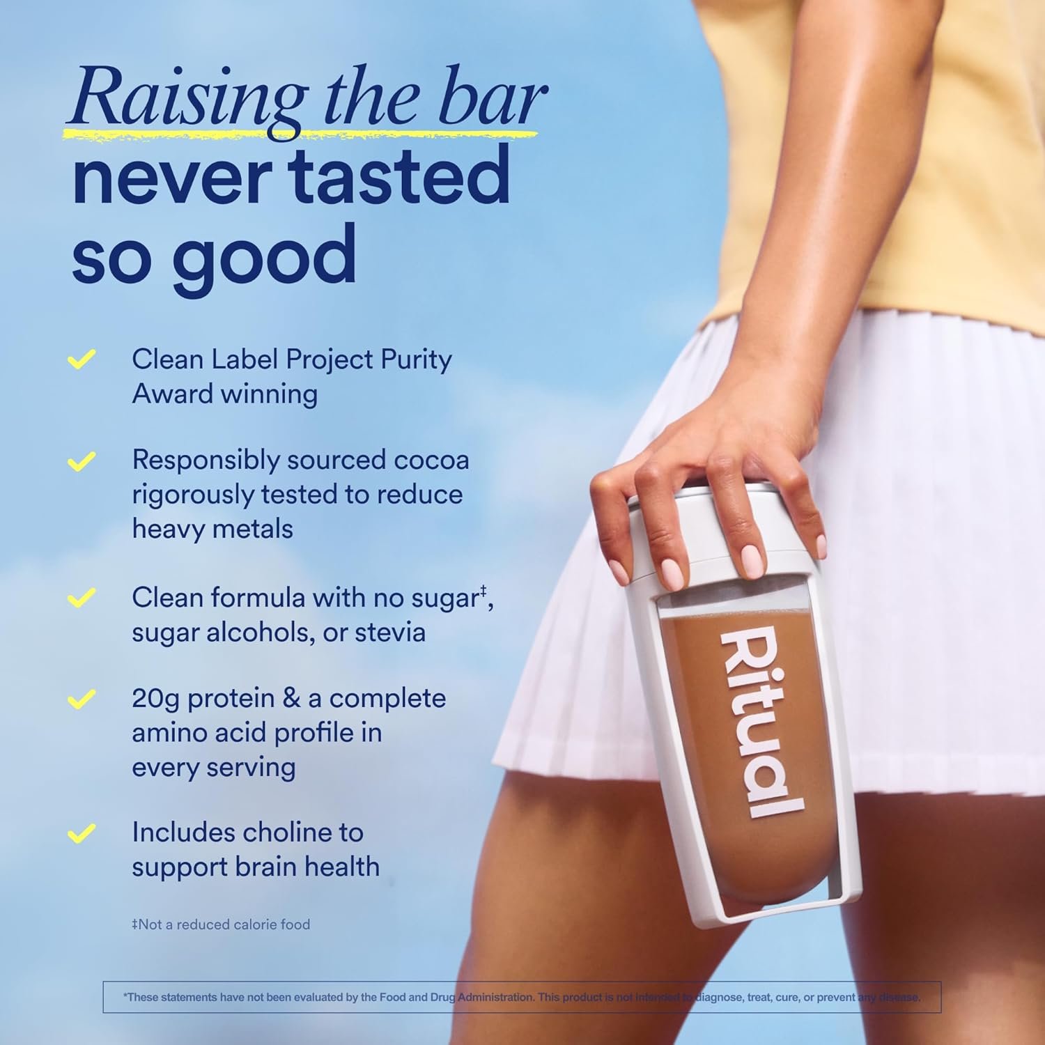 REDUCING PLASTICS: We’re always looking for ways to be more sustainable, and we found that by removing the scoop from our packaging we could reduce Essential Protein’s carbon footprint by 22% while also eliminating plastic. Instead of the scoop, you can use 5 tablespoons or ⅓ cup per serving. Based on Ritual internal 2024 LCA