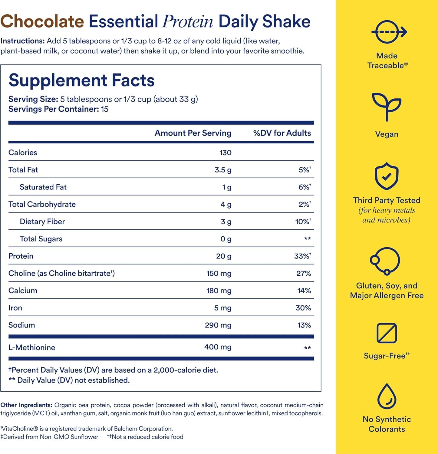 ESSENTIAL PROTEIN DAILY SHAKE: The Clean Label Project Purity Award winning traceable plant-based protein to help form lean muscle and support muscle recovery after exercise.* Each serving provides a complete amino acid profile with 20g of protein, zero net carbs^, 0g of sugar, and 4g BCAAs.(^Net carbs = total carbs-dietary fiber)