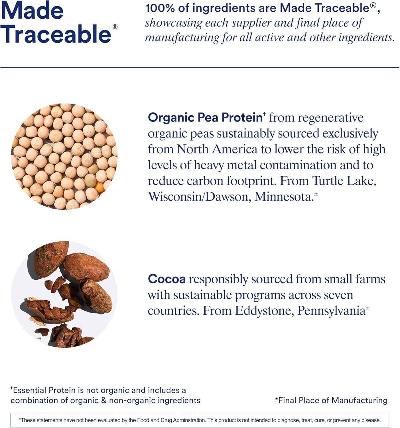 MADE TRACEABLE: Our world-class scientists scoured the globe for high quality ingredients when formulating Essential Protein Daily Shake 18+. Our plant-based formula includes responsibly sourced cocoa from small farms with sustainable programs, rigorously tested to reduce heavy metals, and regenerative organic peas exclusively from North America to reduce carbon footprint. (Essential Protein is not organic and includes a combination of organic & non-organic ingredients)