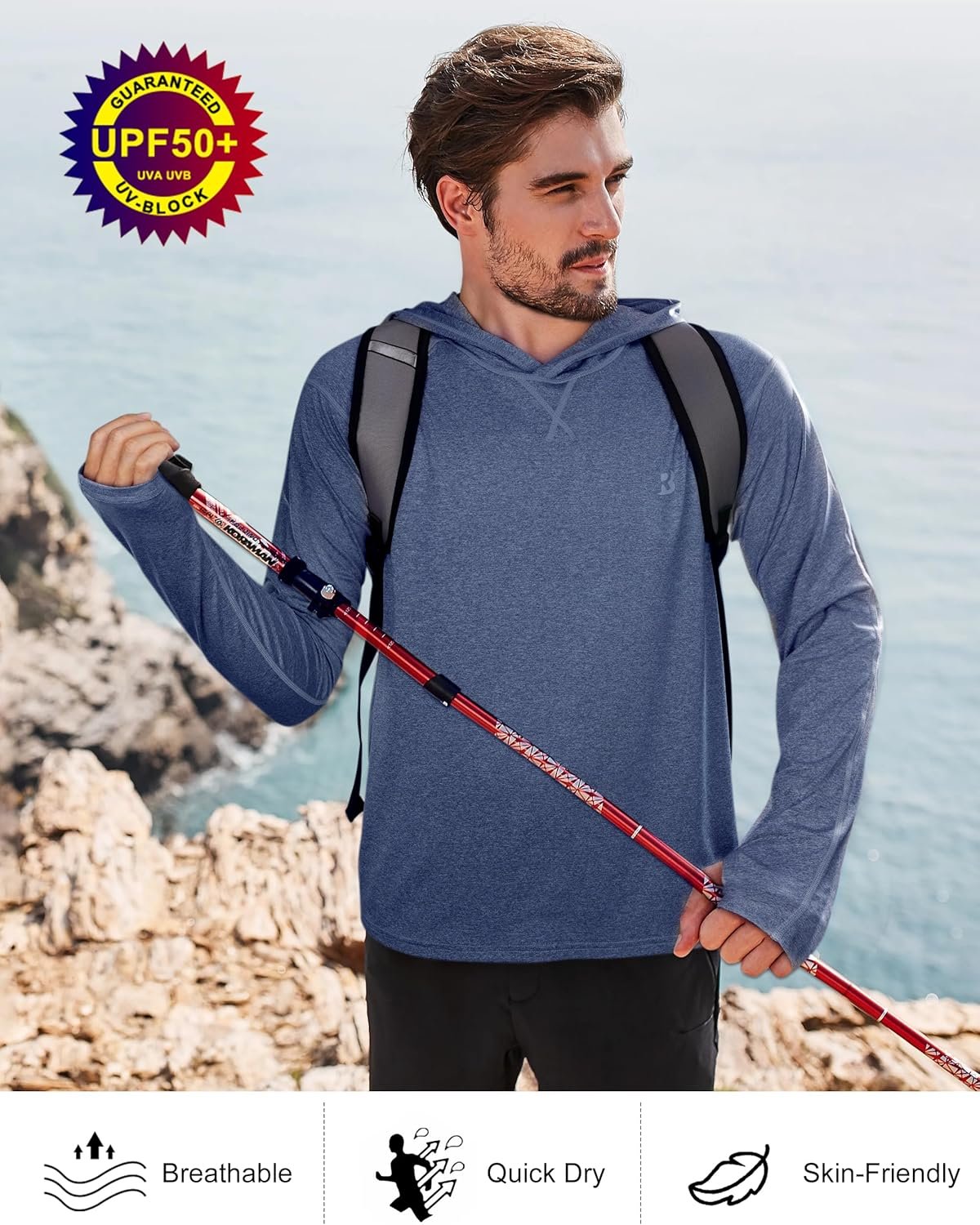 Roadbox Mens UPF 50+ Fishing Shirts, Long Sleeve UV Sun Hoodie, Hiking Running Swim Athletic Workout Shirt