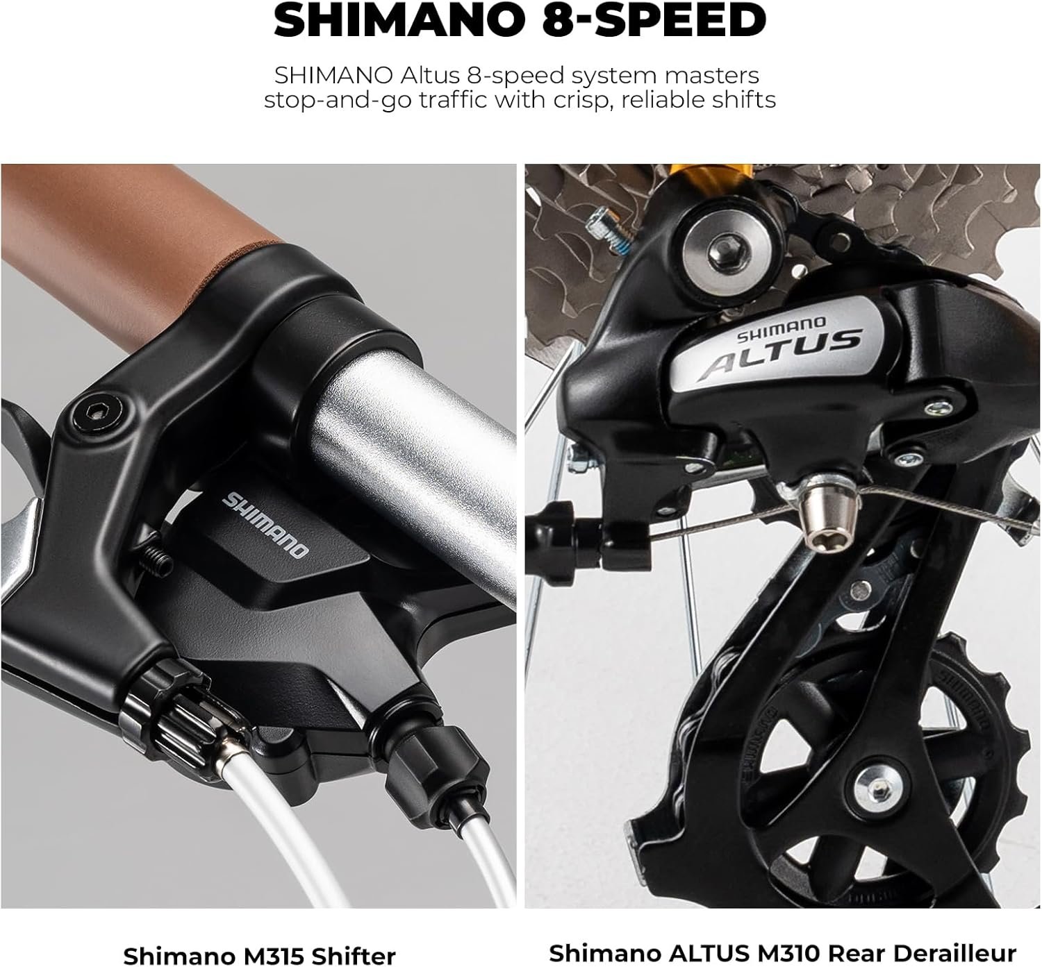 Smooth Shimano 8-Speed Shifting – This Folding Bike for Adults is equipped with Shimano SL-M315 shifter and RD-M310 derailleur for precise, quick gear changes—ideal for both hilly rides and flat city roads.