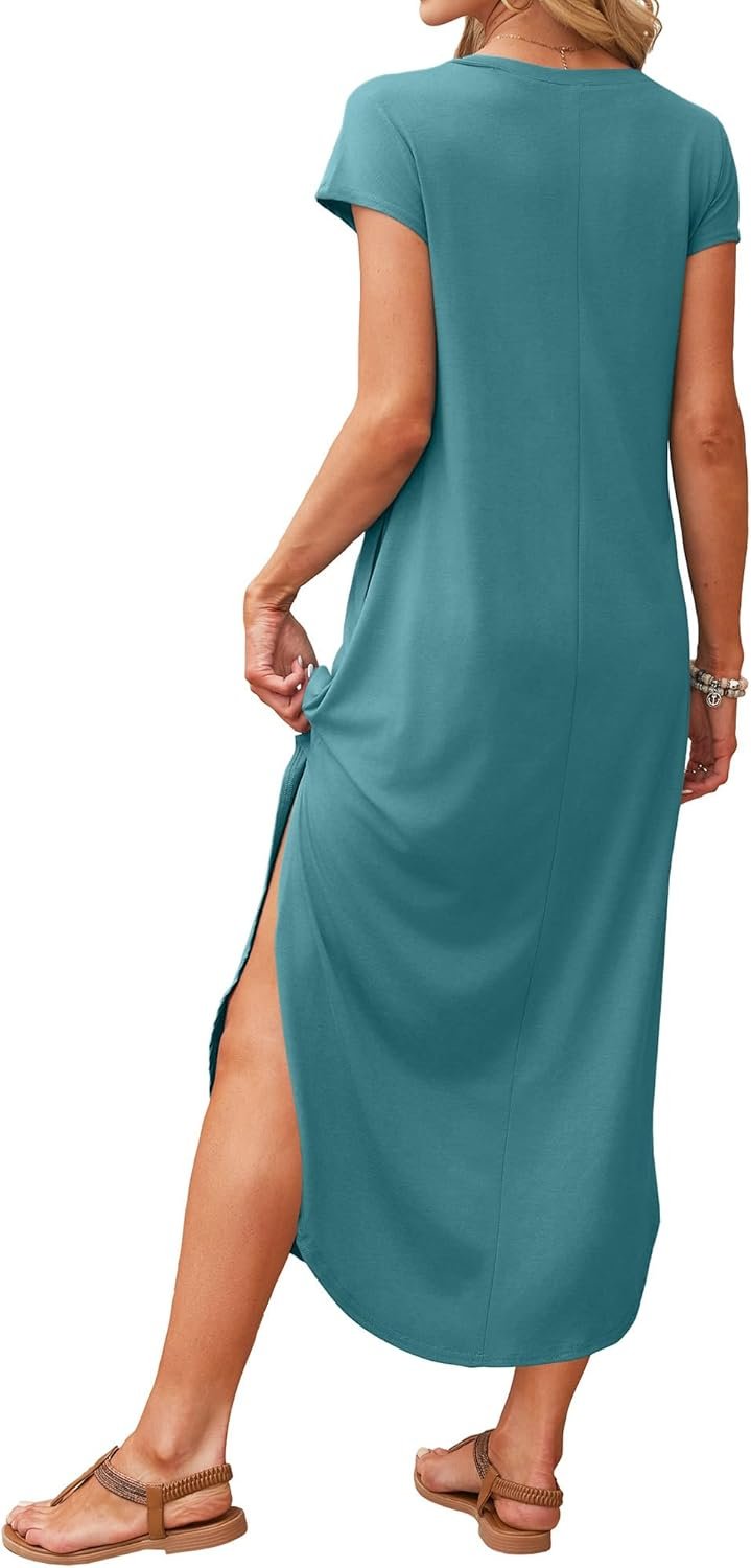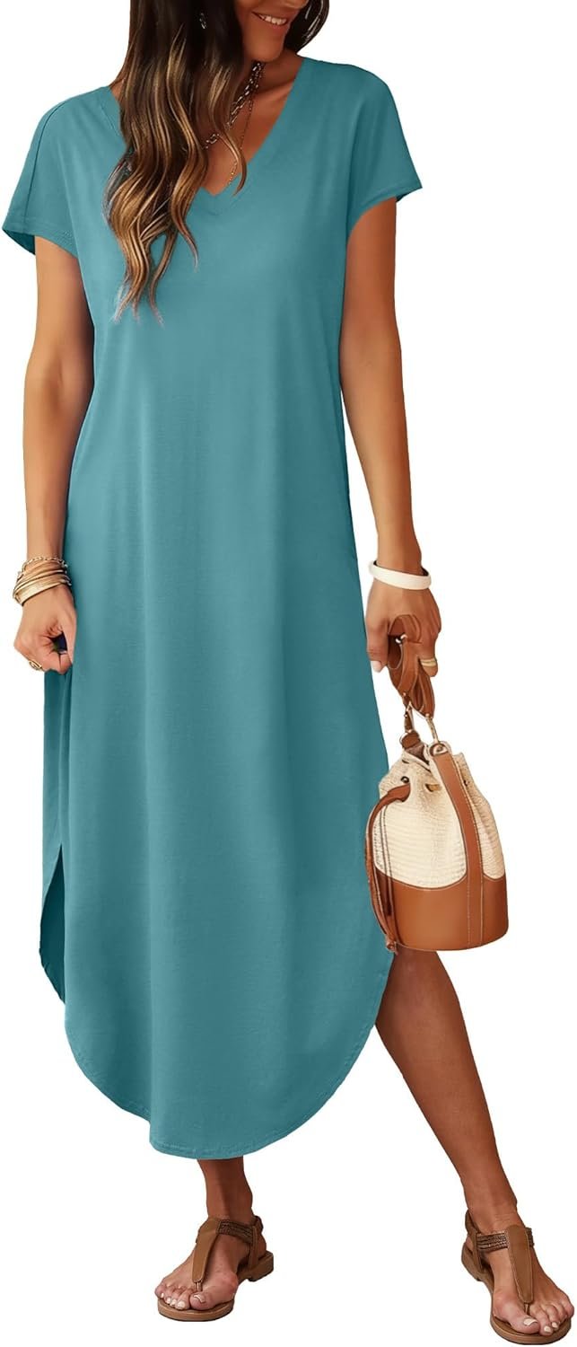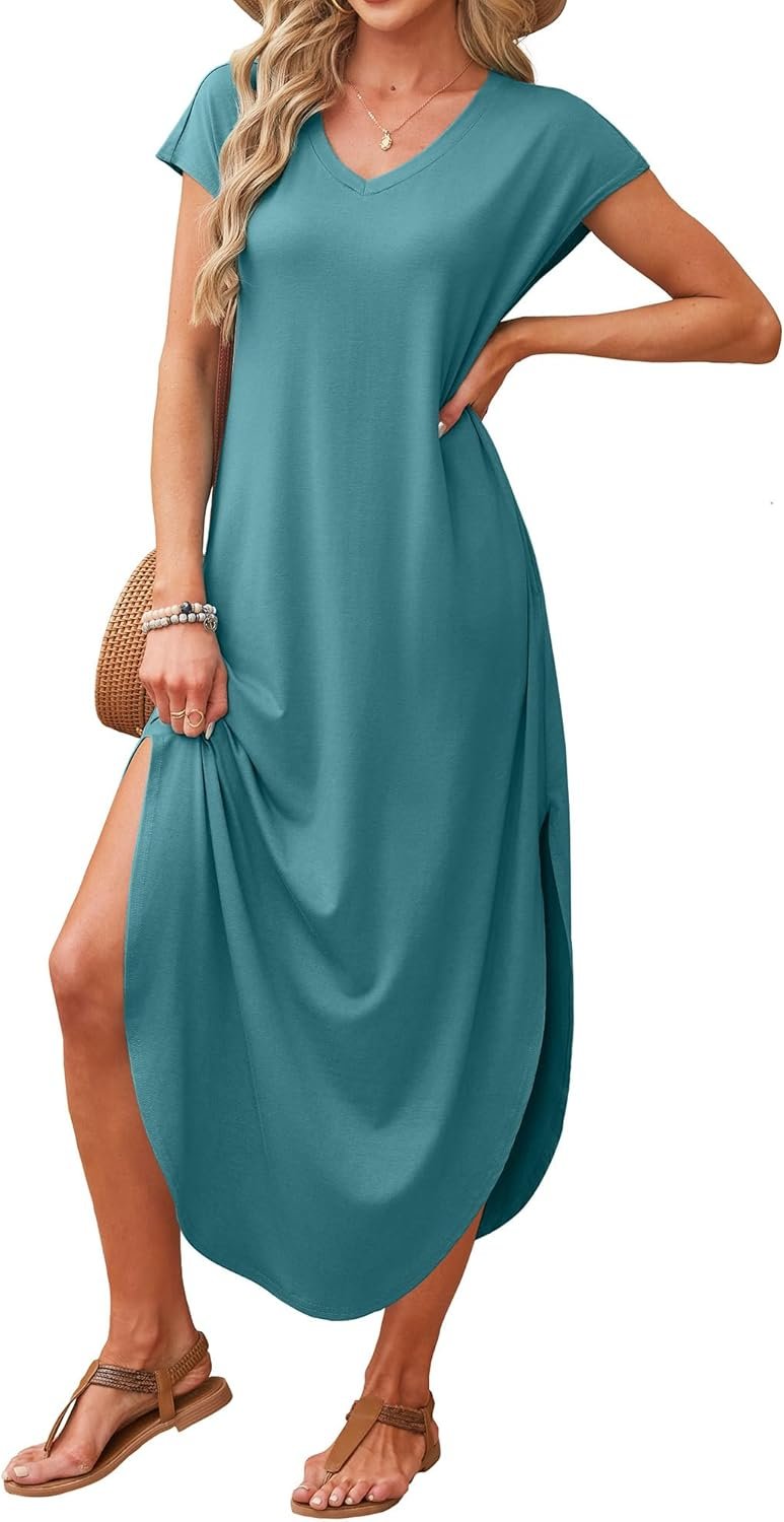 RUMIA Summer Casual Maxi Dresses for Women- Women’s V Neck Cap Sleeve Long Sundress with Pockets Beach Vacation