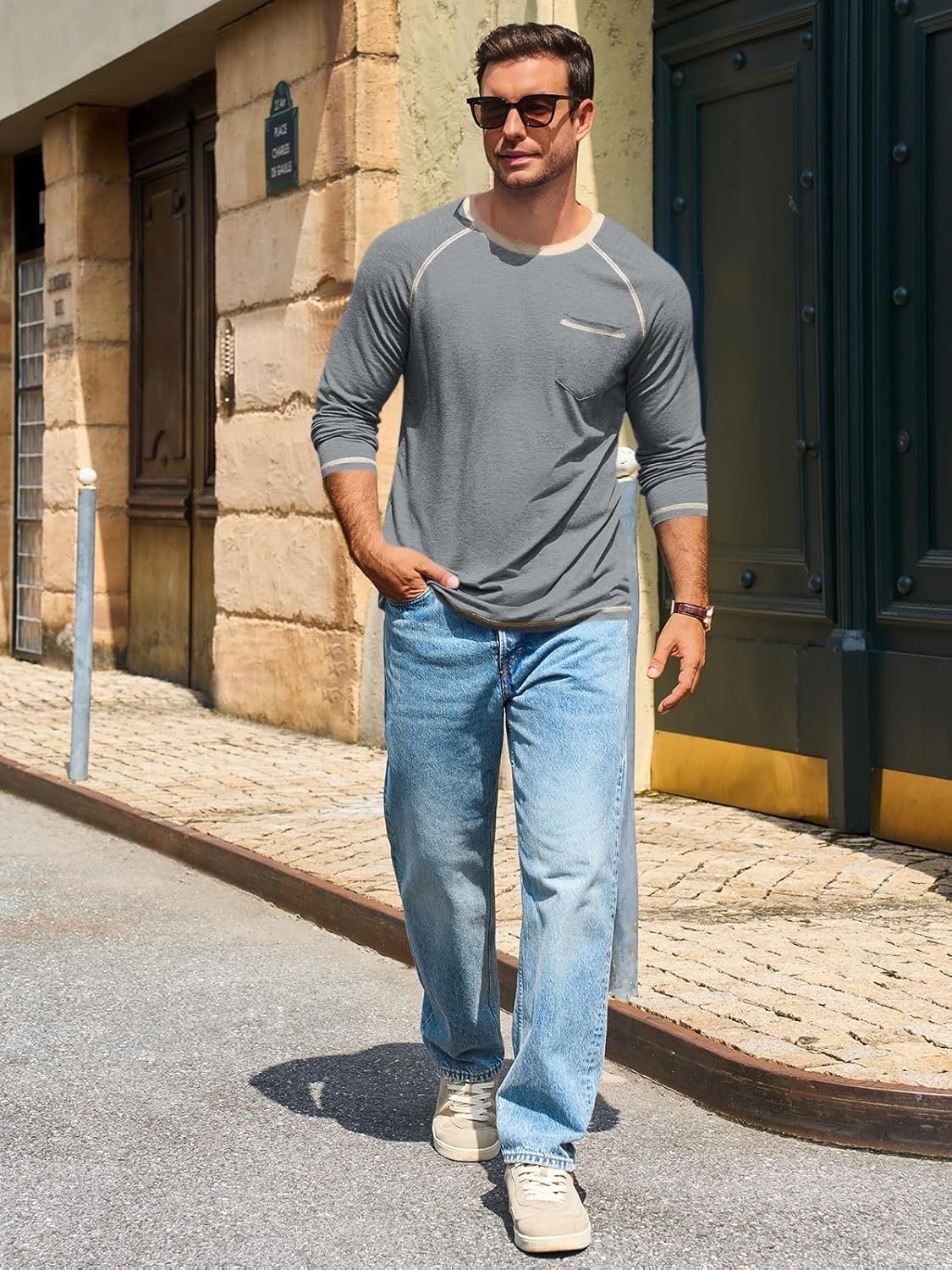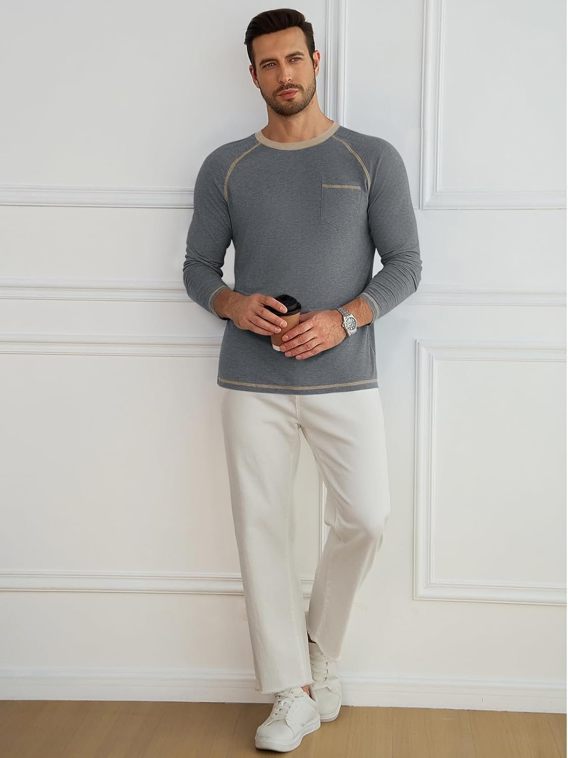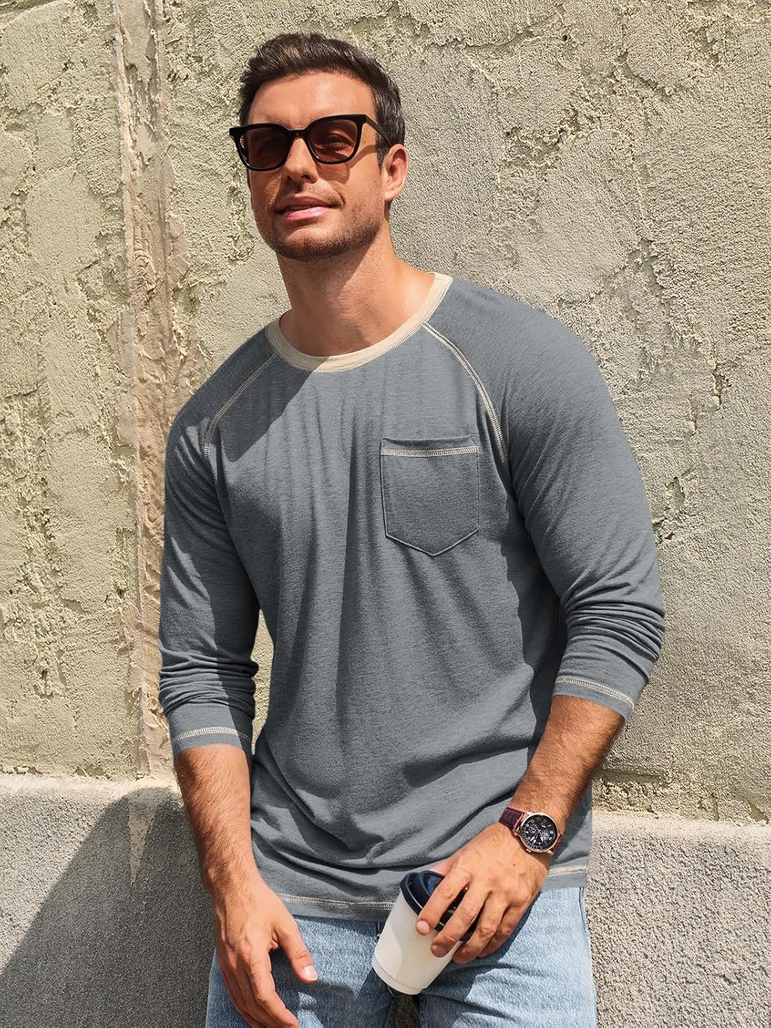 Runcati Mens Long Sleeve T-Shirt Casual Crewneck Shirts Basic Lightweight Vintage Tee Tops with Pocket
