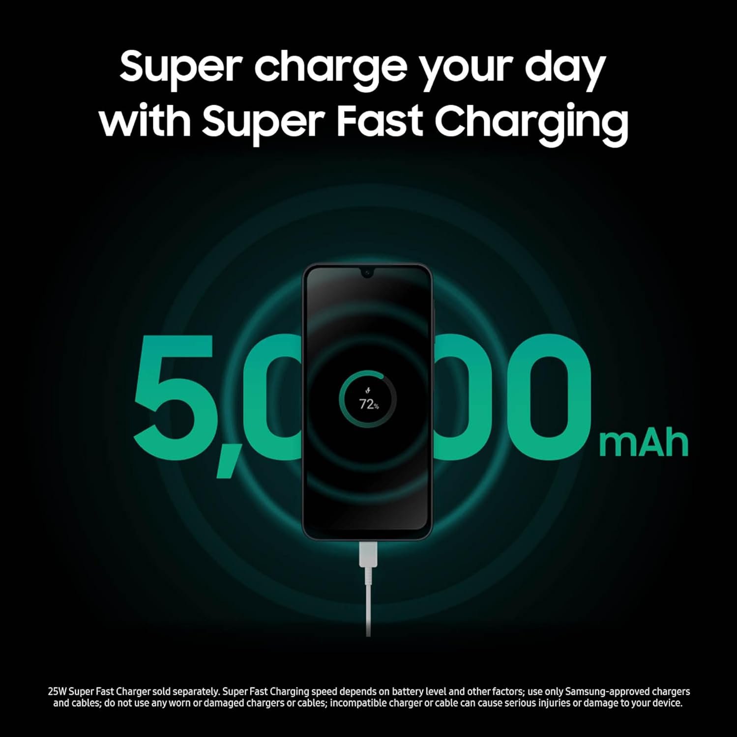 ²25W Super Fast Charger sold separately. Super Fast Charging speed depends on battery level and other factors; use only Samsung-approved chargers and cables; do not use any worn or damaged chargers or cables; incompatible charger or cable can cause serious injuries or damage to your device.